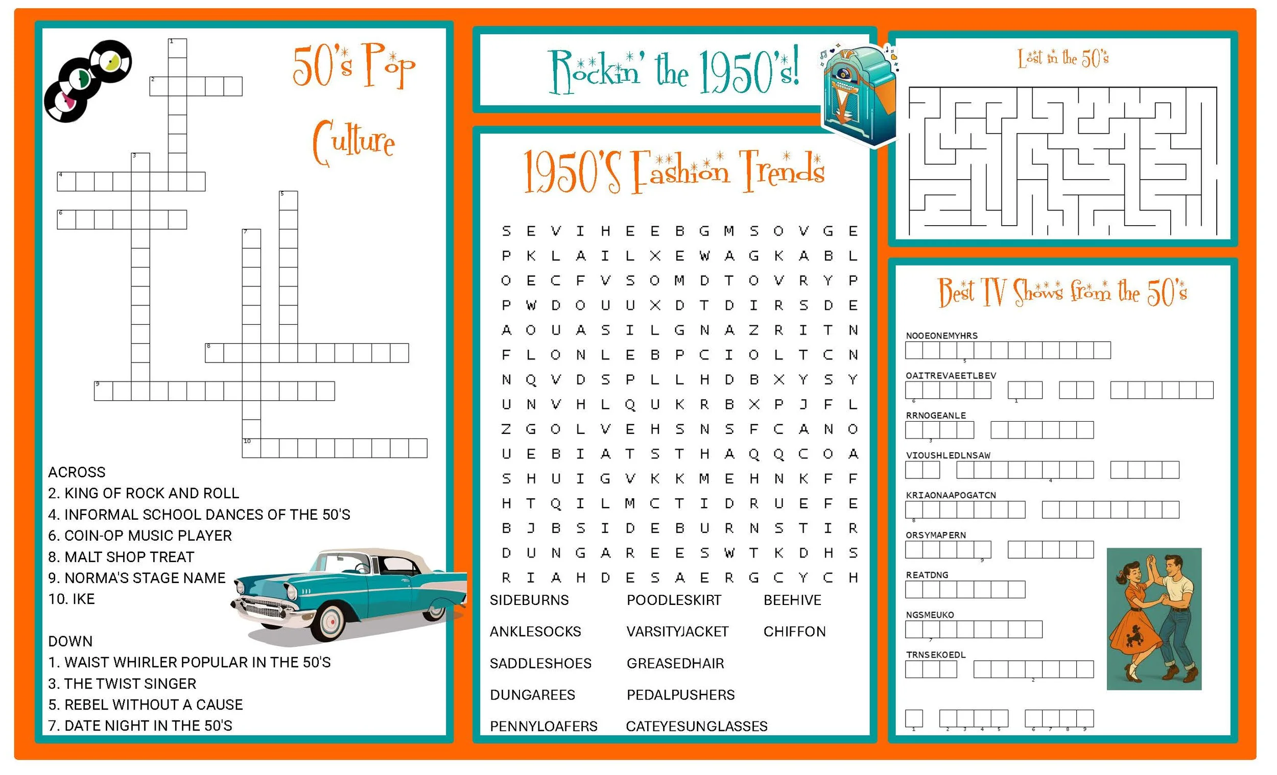 Your 1950's themed party needs these placemats on the table! Keep your guests entertained with a fun mix of puzzles inspired by classic ’50s pop culture—crossword puzzles, word searches, mazes, and secret message challenges. Perfect for sparking nostalgia and conversation while adding a playful touch to your retro celebration. These placemats are the ultimate blend of style and fun for any rockabilly bash or sock hop!