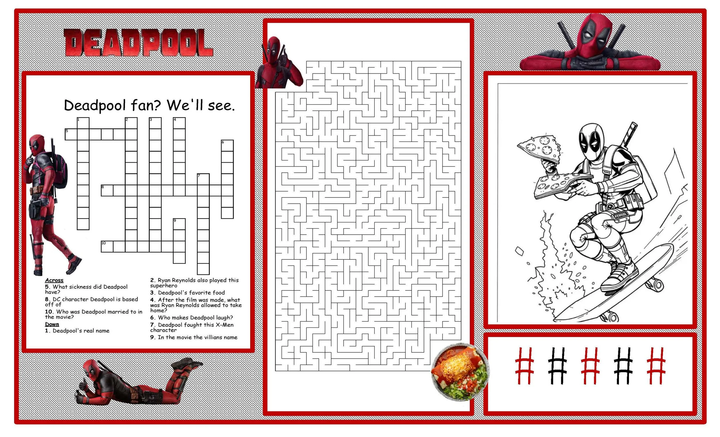 Keep your guests entertained for hours with our Deadpool Activity Placemat! Packed with a fun crossword puzzle, a giant maze, a classic tic tac toe game, and a vibrant coloring image, this placemat brings the perfect mix of challenge and creativity to your party table. Whether kids or adults, everyone will love diving into these engaging activities inspired by everyone's favorite witty antihero. Perfect for birthdays, family dinners, or any occasion where fun is the main course!