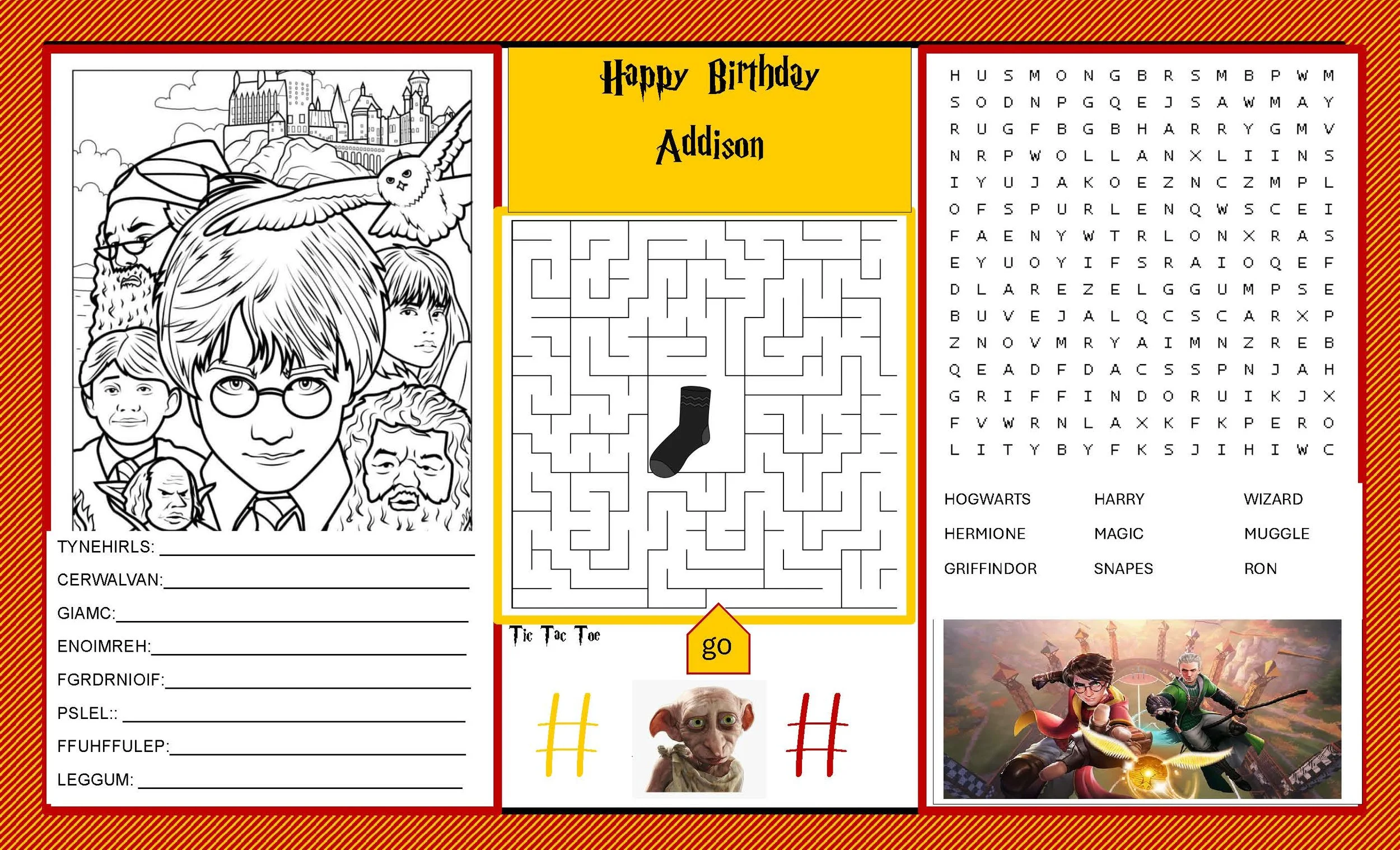 Bring the magic of Hogwarts to your next party with our enchanting Harry Potter themed activity placemats! Each placemat is designed to keep young witches and wizards entertained, featuring a delightful coloring image that sparks creativity. Challenge them to unscramble magical words, navigate through a whimsical maze, solve a thrilling word search, and engage in classic tic tac toe. Perfect for birthday celebrations, school events, or playdates, these activity placemats will ensure hours of fun while adding a touch of wizardry to your gathering. Transform your party into an unforgettable adventure at the wizarding world!