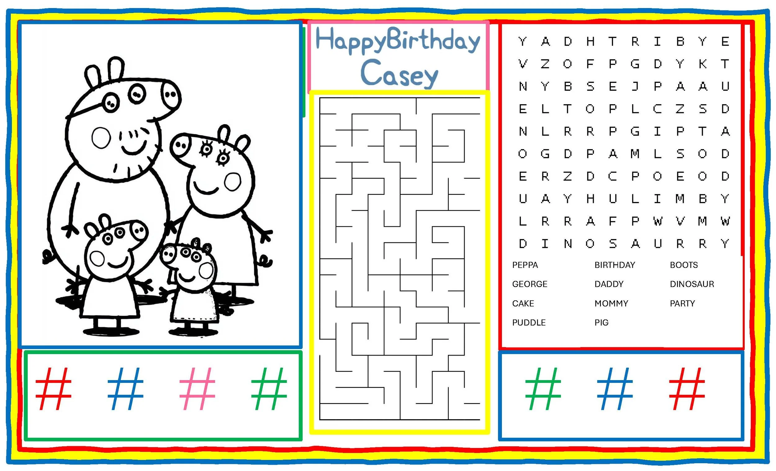 Introducing our Peppa Pig Activity Placemats! Perfect for keeping little hands busy and minds engaged during mealtime or playtime, these colorful placemats feature a delightful maze to navigate, a fun word search to boost vocabulary, an adorable coloring image to spark creativity, and a classic game of tic tac toe for friendly competition. Each placemat is designed with Peppa and her friends, ensuring a fun and entertaining experience for children of all ages. Great for parties, family gatherings, or just a special treat at home!