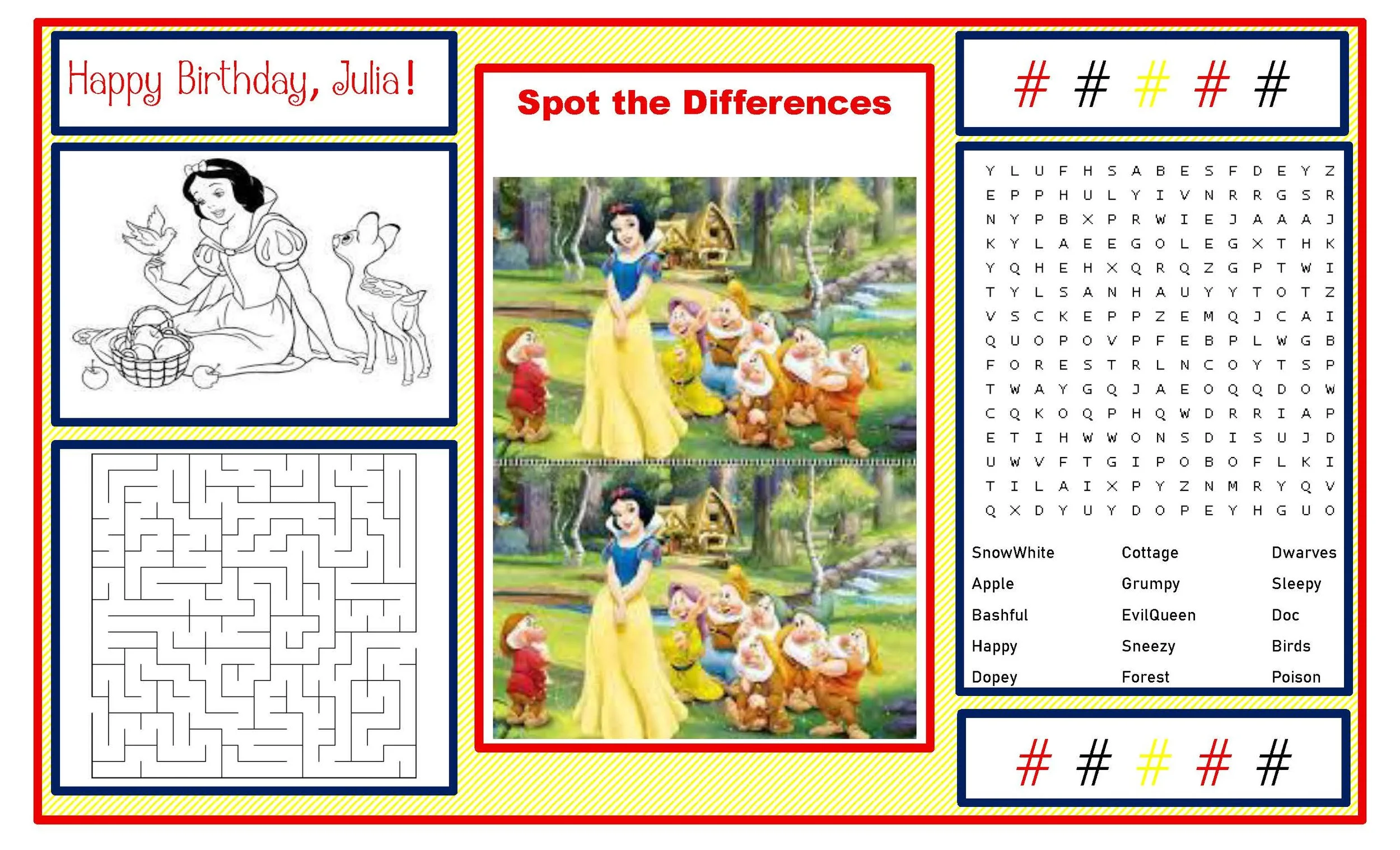 Keep little guests happily entertained with our Snow White Activity Placemat! Featuring a charming maze, a fun word search, a classic tic tac toe game, a spot-the-difference challenge, and a delightful Snow White coloring image, this placemat is perfect for sparking creativity and friendly competition at any party. Handmade with love, it’s a magical way to keep kids engaged while they wait for their treats!