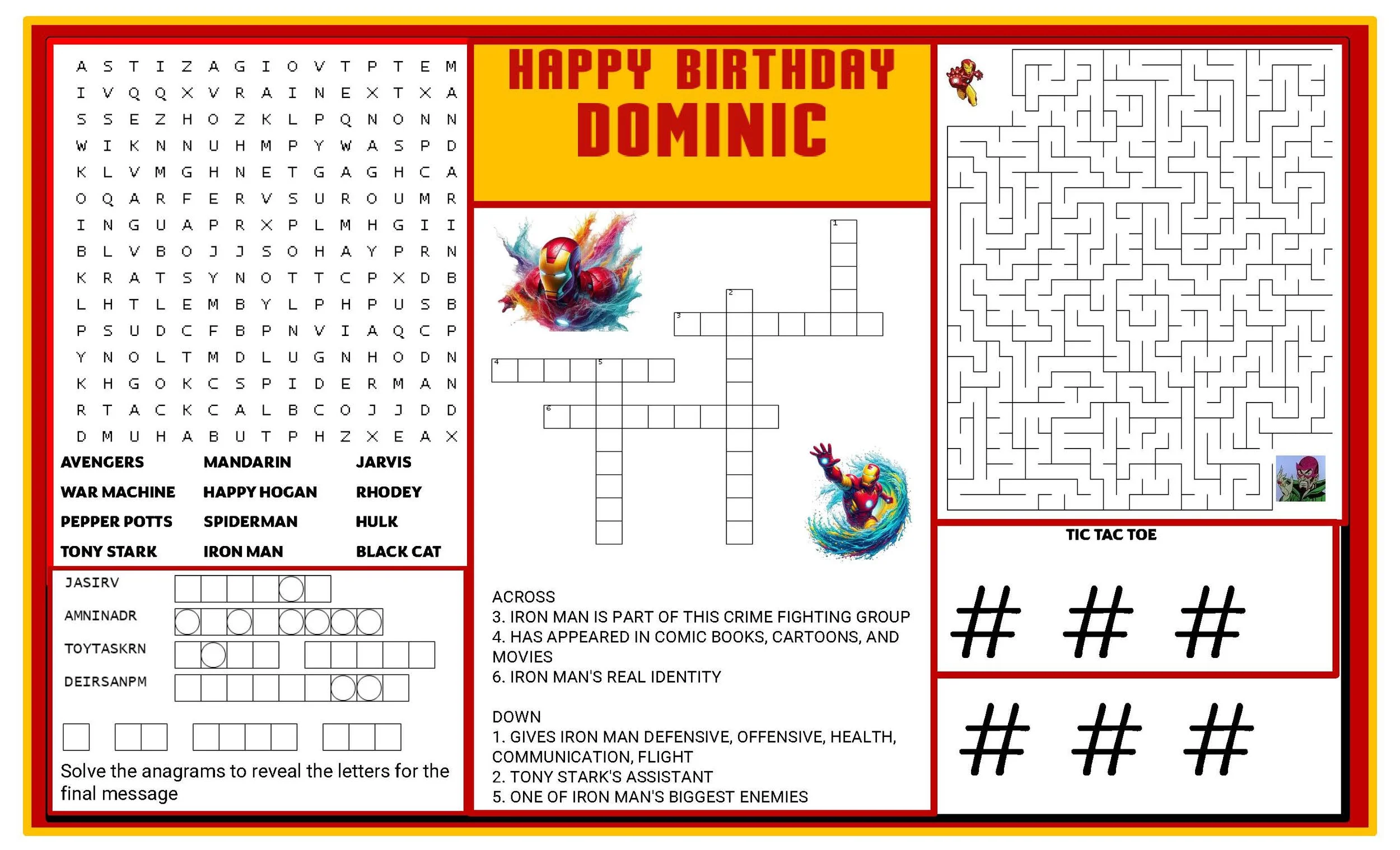 Unleash your creativity and problem-solving skills with our Iron Man Activity Placemat! This vibrant and engaging placemat is filled with hours of fun, featuring a word search, crossword puzzle, tic tac toe, and a challenging maze, and secret message puzzle. . Perfect for parties, playdates, or family dinners, this placemat keeps kids entertained while sparking their imagination. Dive into the action with Iron Man today!