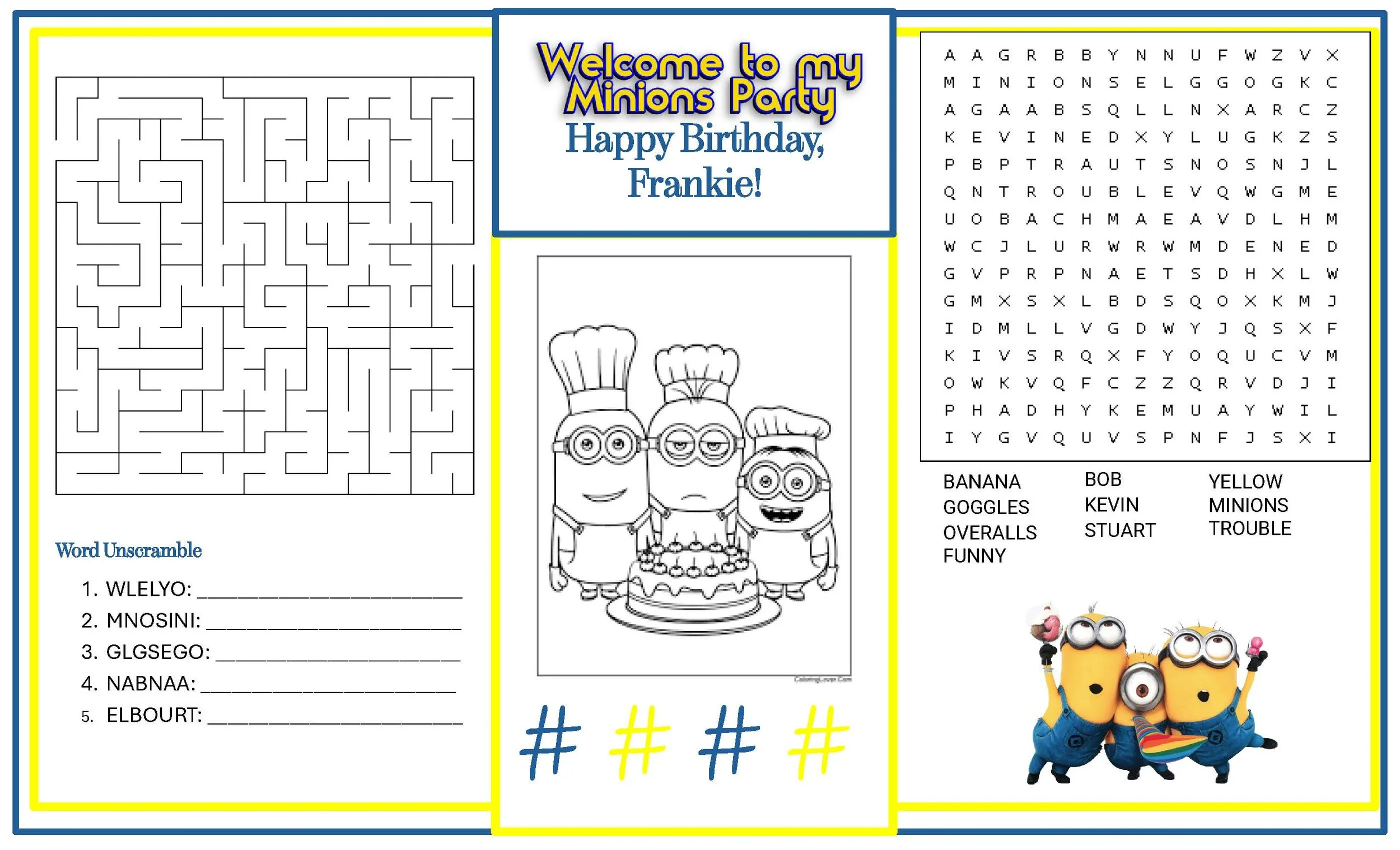 Unleash your creativity and keep little hands busy with our delightful Minions activity placemat! Perfect for parties or quiet time at home, this placemat is packed with fun activities that include a colorful coloring image, an engaging word search, an exciting maze, a word unscramble challenge, and a classic game of tic-tac-toe. Ideal for kids of all ages, it's a great way to combine learning and play while celebrating the beloved Minions. Capture the joy of these mischievous characters as your children dive into hours of entertainment!