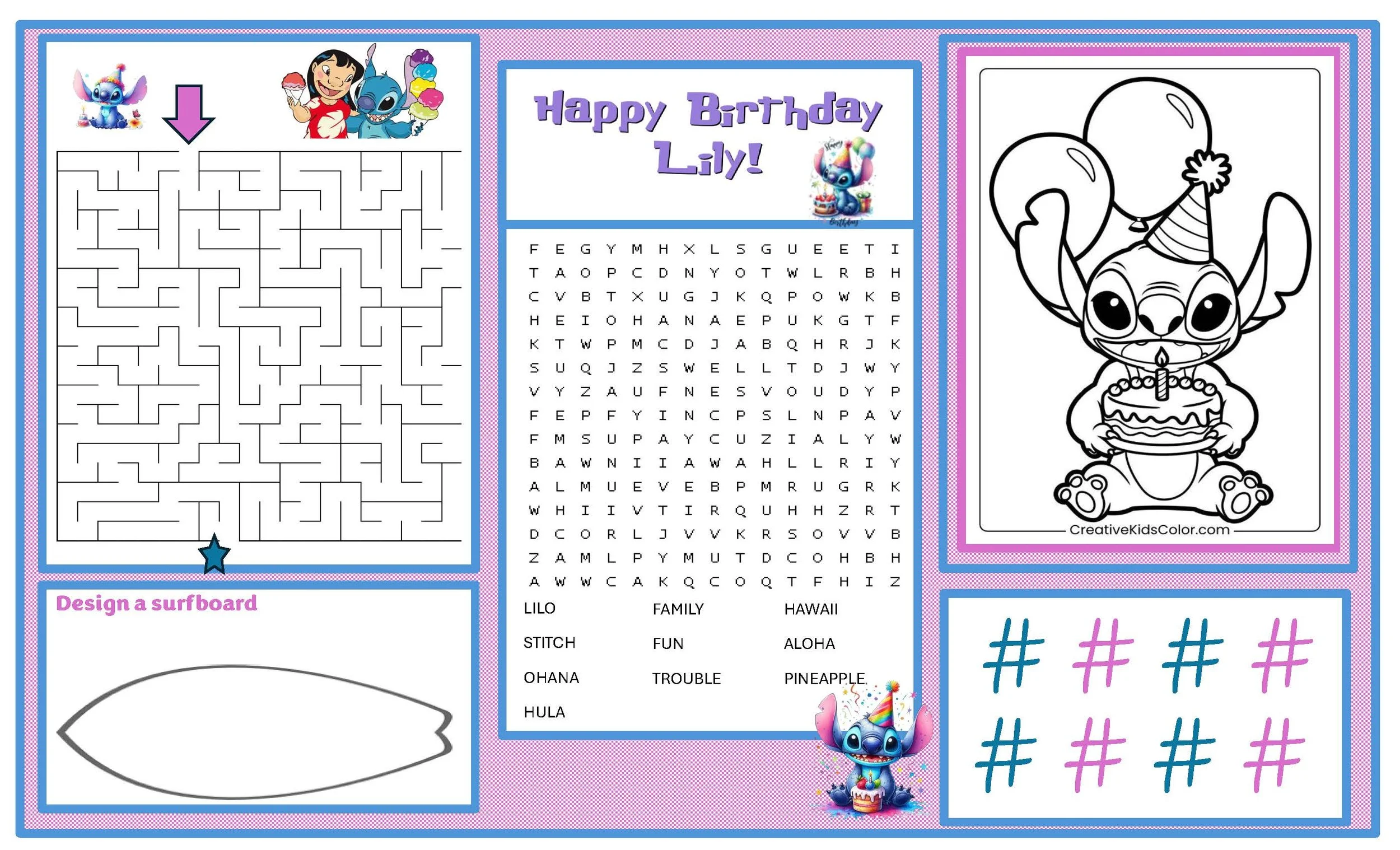 Elevate your party table settings with our charming Stitch activity placemat! Featuring everyone's favorite mischievous alien from Lilo and Stitch, this placemat is not just for keeping tables clean; it's a gateway to creativity and entertainment. Your little ones will love bringing Stitch to life with a delightful coloring image, while they challenge their brains with an exciting word search, navigate through a tricky maze, and engage in thrilling rounds of tic-tac-toe. Perfect for parties or everyday meals, this placemat transforms dining into a delightful adventure, making it a must-have for every Stitch fan!