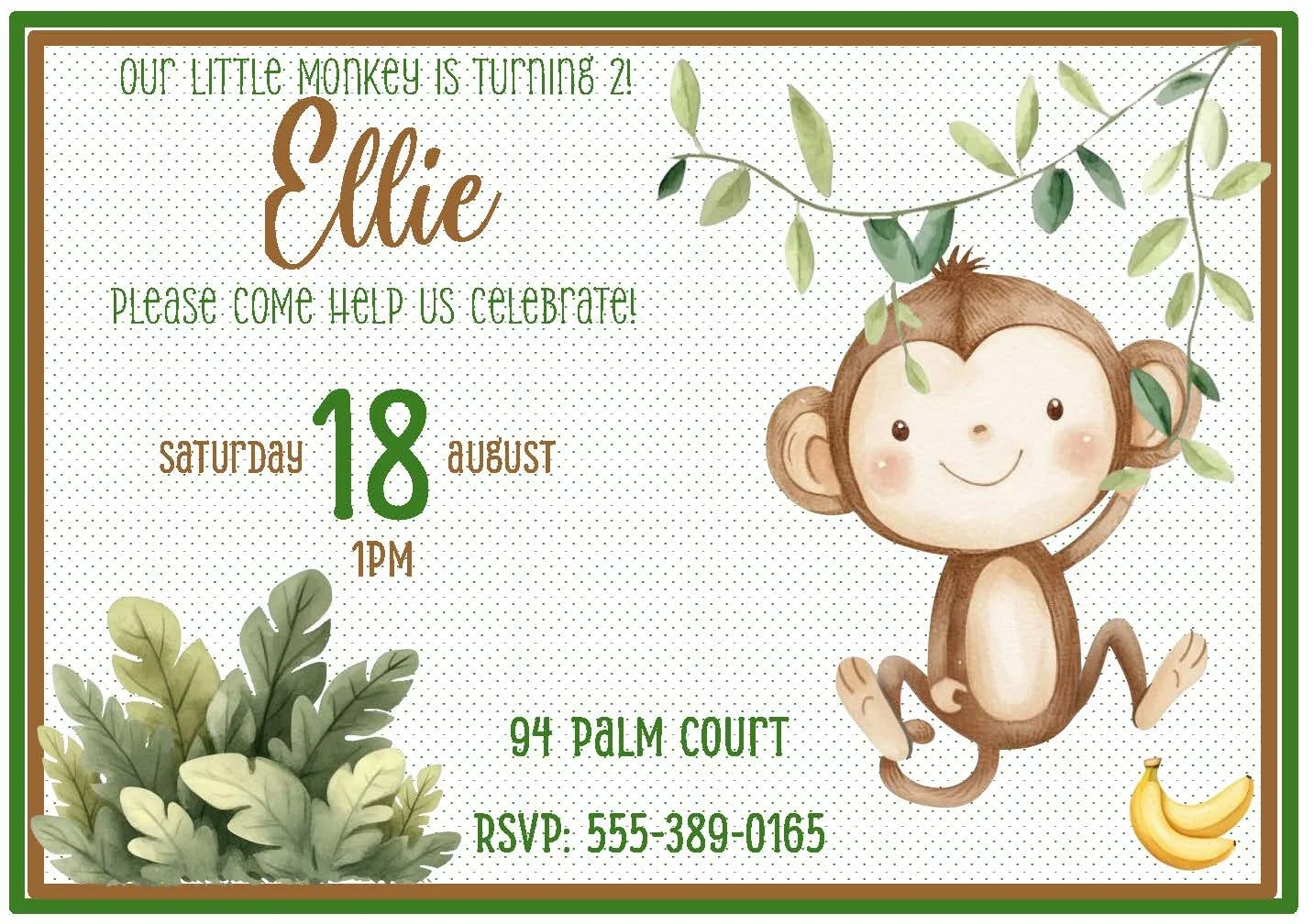 Looking for the perfect party invitation? This clever and cute little monkey will enchant your guests. Bright, playful, and full of personality, it’s ideal for safari, jungle, or animal-themed parties. Handmade with care, the design pops with cheerful colors and whimsical details that set the tone for a fun-filled celebration. Ready to swing into your mailbox and delight both kids and adults alike—this monkey invitation makes party planning a little easier and a lot more adorable.