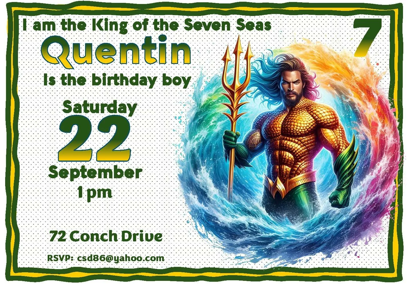 Make a splash with our majestic Aqua Man invitation — powerful, bold, and crafted to command attention. Designed in rich sea-green and shimmering gold, this invite blends oceanic strength with regal style. Perfect for birthdays, hero-themed parties, or any celebration where bravery rules the day. Looking for a different hero? We offer a full lineup of other superheroes and custom color options to match your party’s vibe. Add a touch of royal sea power to your celebration!