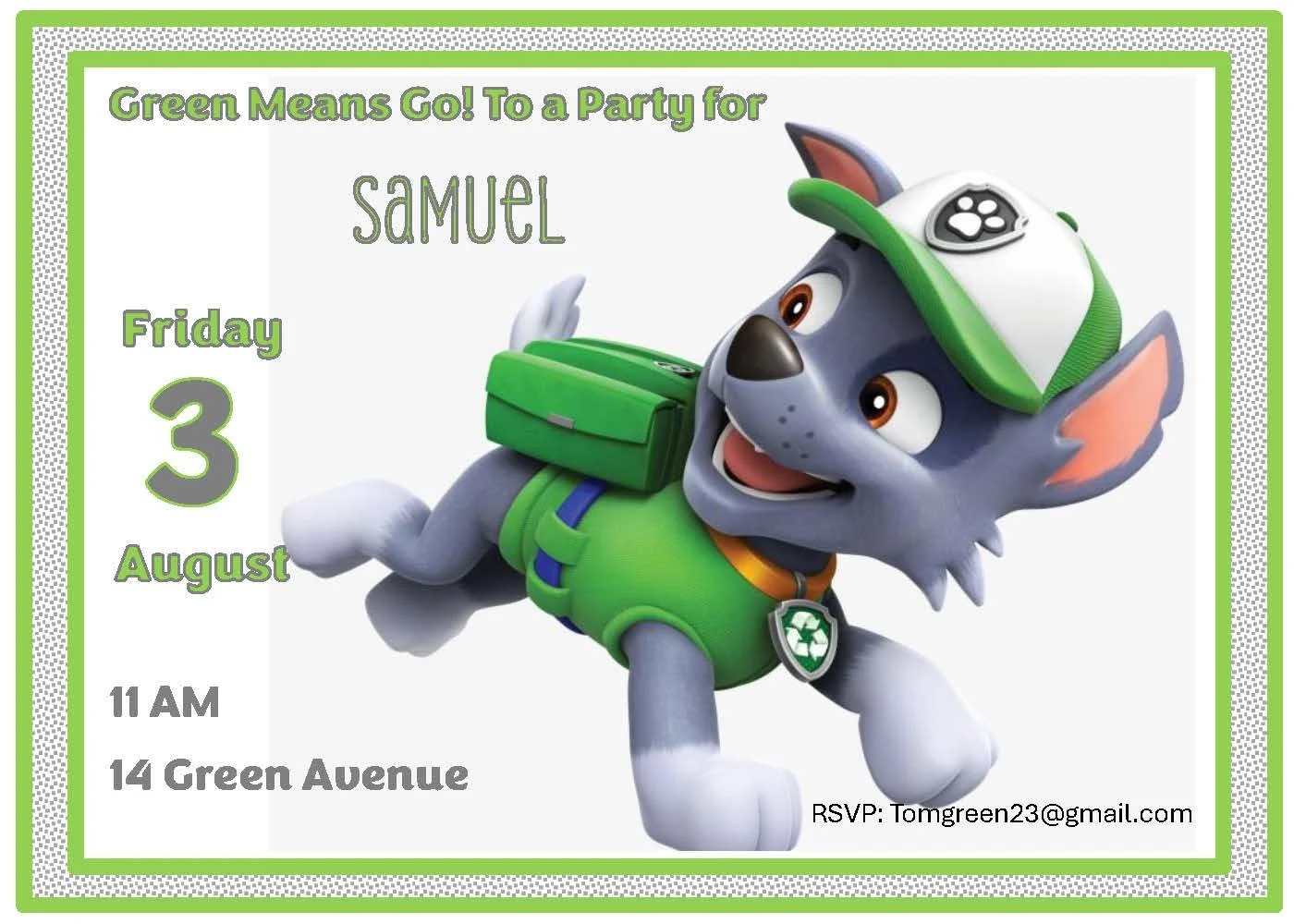 Celebrate Paw Patrol style with these Rocky invitations! Bright green and gray hues plus a cheerful Rocky in action set the tone for a fun, eco-friendly adventure—perfect for pups who love to recycle and help. These invitations are ready to get guests excited and hint at the playful, helpful spirit of the party.