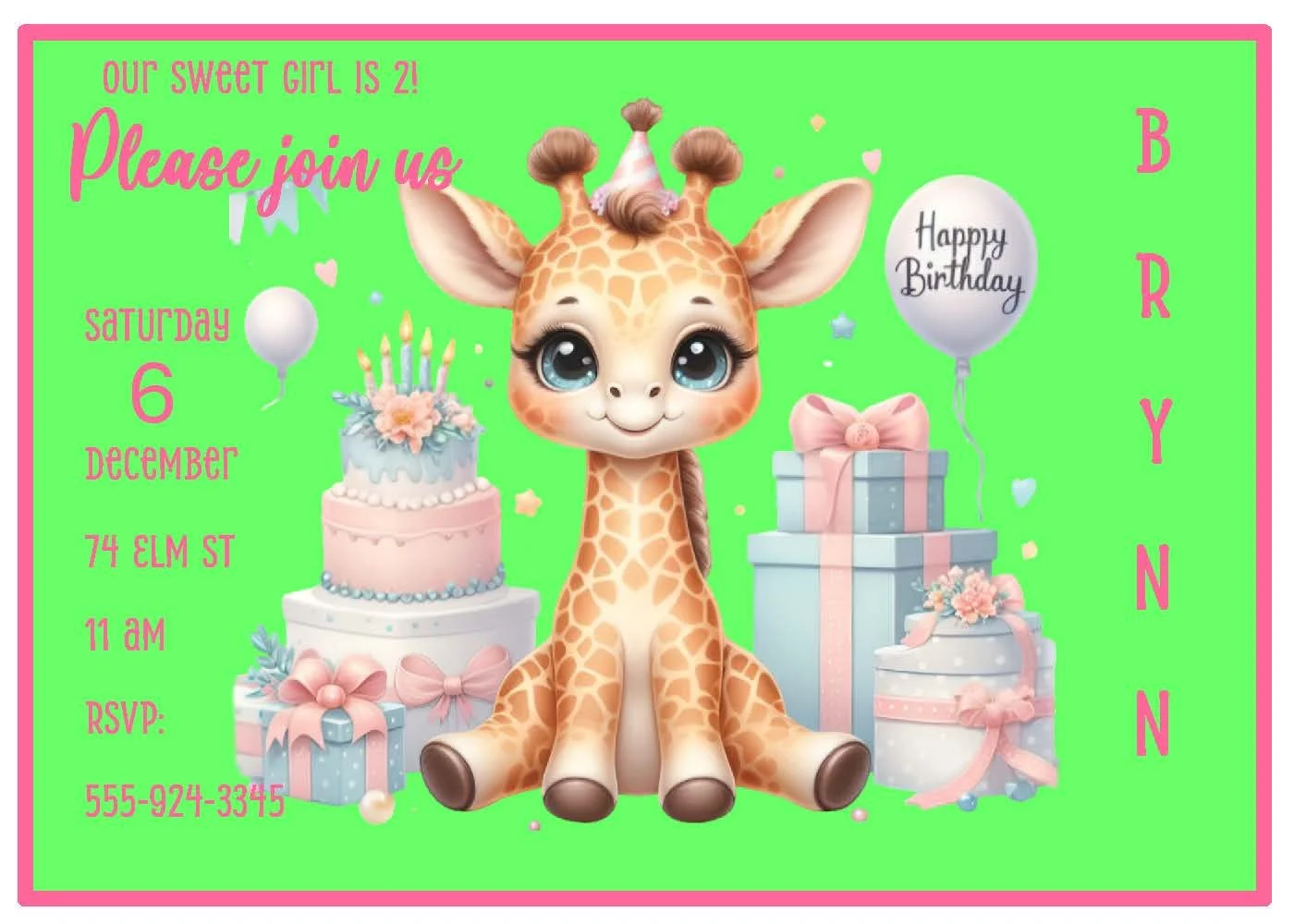 This big-eyed giraffe in soft pink and minty green is utterly irresistible—perfectly cuddly for your little one’s birthday. Sweet and whimsical, this invitation is ideal for first birthdays but works beautifully for any age. Bright, cheerful colors and a lovable design set a playful tone that’s sure to delight guests and make your celebration feel extra special.