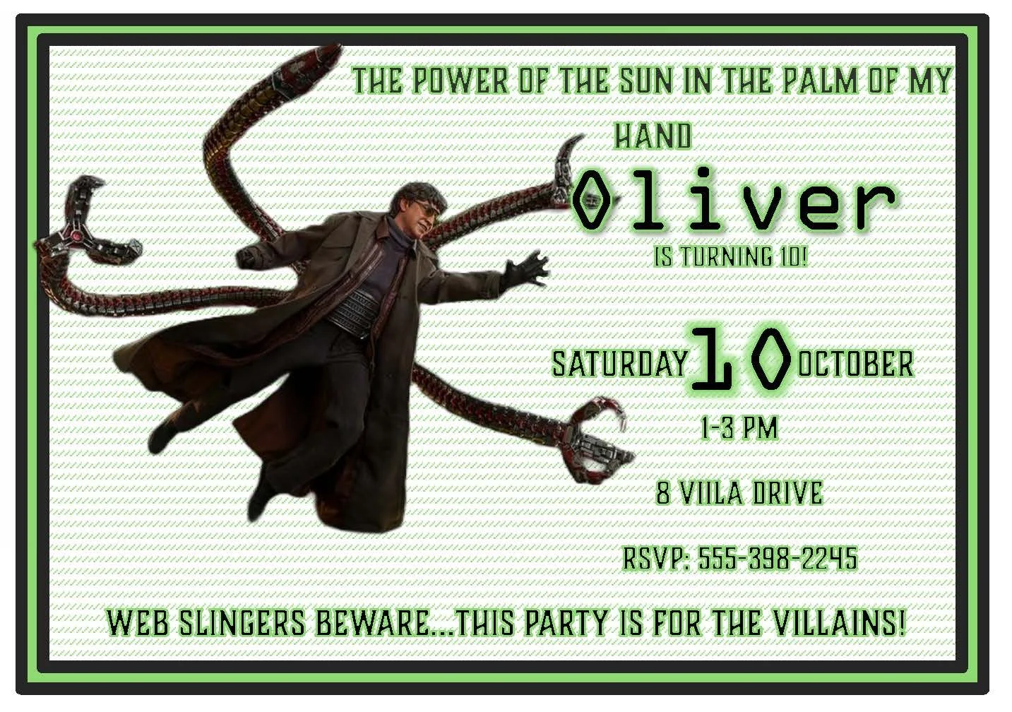 Get your guests excited for a villainous good time with this Doc Ock invitation. Spidey’s nemesis dominates a moody black-and-green background, complete with metallic tentacle accents that scream supervillain swagger. Bold, dramatic typography and a sharp layout make the party details pop—perfect for birthday bashes, themed game nights, or any event where mischief is on the menu. This invitation brings comic-book energy and wicked fun to your celebration.