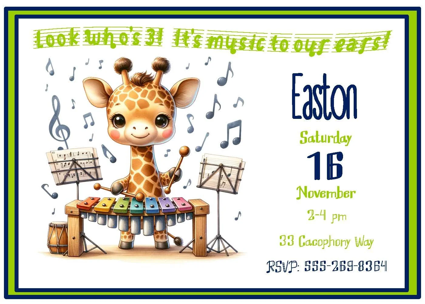This adorable giraffe invitation is perfect for your little musician. A friendly giraffe joyfully plays a colorful xylophone while cheerful music notes float overhead, setting a playful, musical tone for your celebration. Bright colors and whimsical artwork make this invite ideal for birthday parties, music recitals, or any event where little ones—and their tunes—take center stage. Personalize with party details for a charming, one-of-a-kind invite that will have guests excited to join the fun.