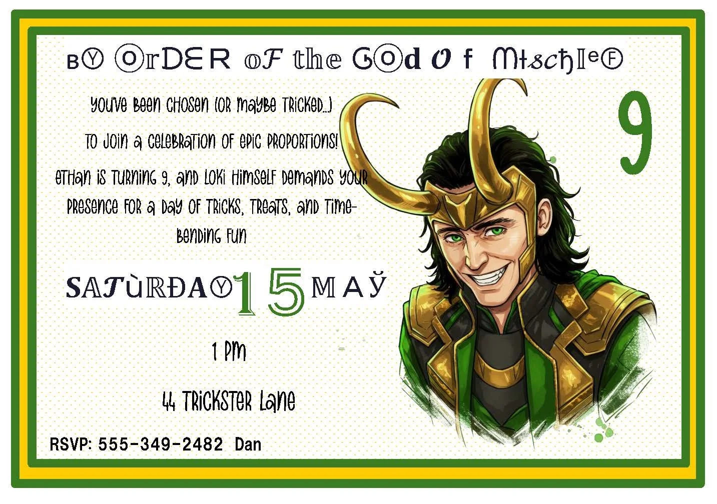 This Loki invitation is mischievous and a little naughty—just like the trickster himself. Featuring a bold green and gold backdrop, the design pairs playful, themed lettering with clever wording that lets guests know fun (and a little chaos) is on the agenda. Perfect for fandom parties or anyone who loves a wink of mischief, this invite sets the tone: stylishly sly, a touch rebellious, and utterly unforgettable.
