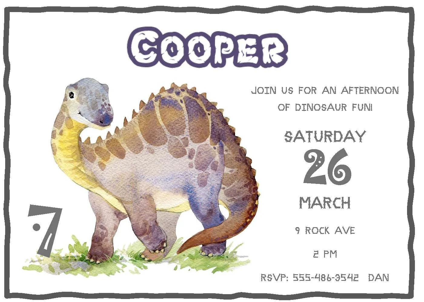 This dinosaur invitation features life-like dinosaurs and an original dino-inspired font for eye-catching visual interest. Bold, detailed illustrations bring the prehistoric world to life, while the playful typography adds personality perfect for invitations, thank-you notes, or party signage. Ideal for your budding paleontologist or any dino fan—fun, memorable, and ready to set the tone for an adventure-filled celebration.