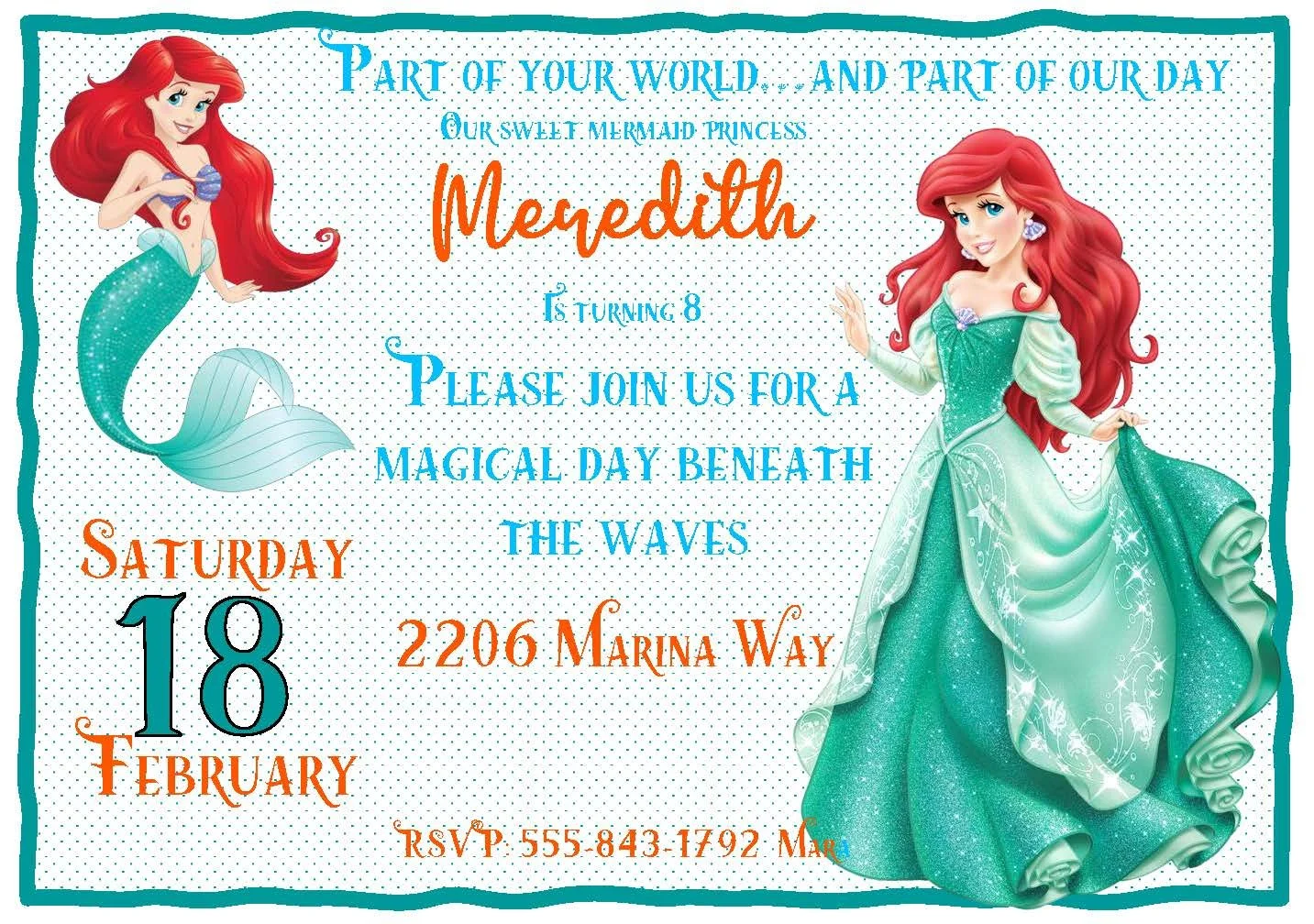 This Ariel invitation stars Ariel in both her human and mermaid forms, capturing her adventurous spirit and timeless charm. Luscious, flowing hair frames each image while themed, whimsical fonts complete the look. Perfect for birthdays, pool parties, or under-the-sea celebrations—charming, colorful, and ready to make your little one’s party feel truly magical.