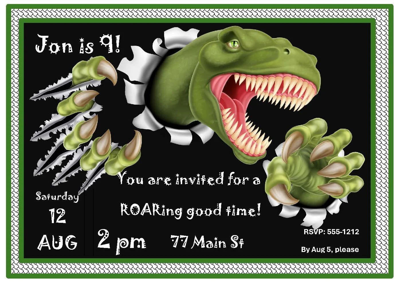 This (not too) scary dinosaur invitation will get your guests excited for a roaring good time! Featuring a playful dino crashing through the card, it’s the perfect mix of bold fun and kid-friendly charm. Bright colors, dynamic design, and just the right amount of prehistoric mischief set the tone for a party full of games, snacks, and stomping good memories. Ideal for birthdays and dino-themed celebrations — send one and watch the excitement begin!