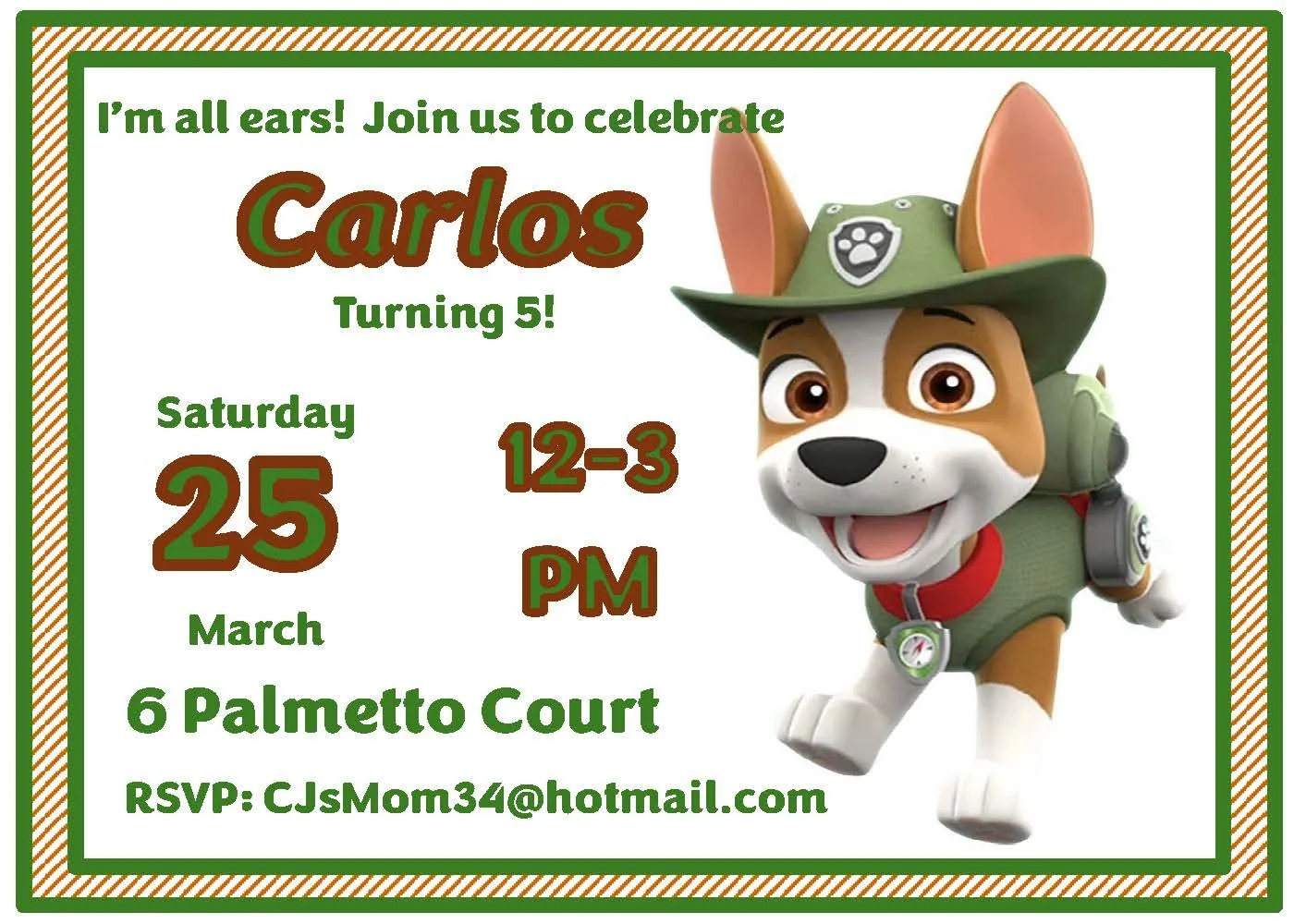 This Tracker invitation celebrates the adventurous Paw Patrol pup with outdoorsy green and rugged brown tones for a fun, nature-ready look. Featuring Tracker front and center, plus plenty of other Paw Patrol characters and coordinating colors available, it’s perfect for young explorers who love adventure. Customizable details and matching party items make it easy to build a themed celebration that’s playful, bold, and ready for action.