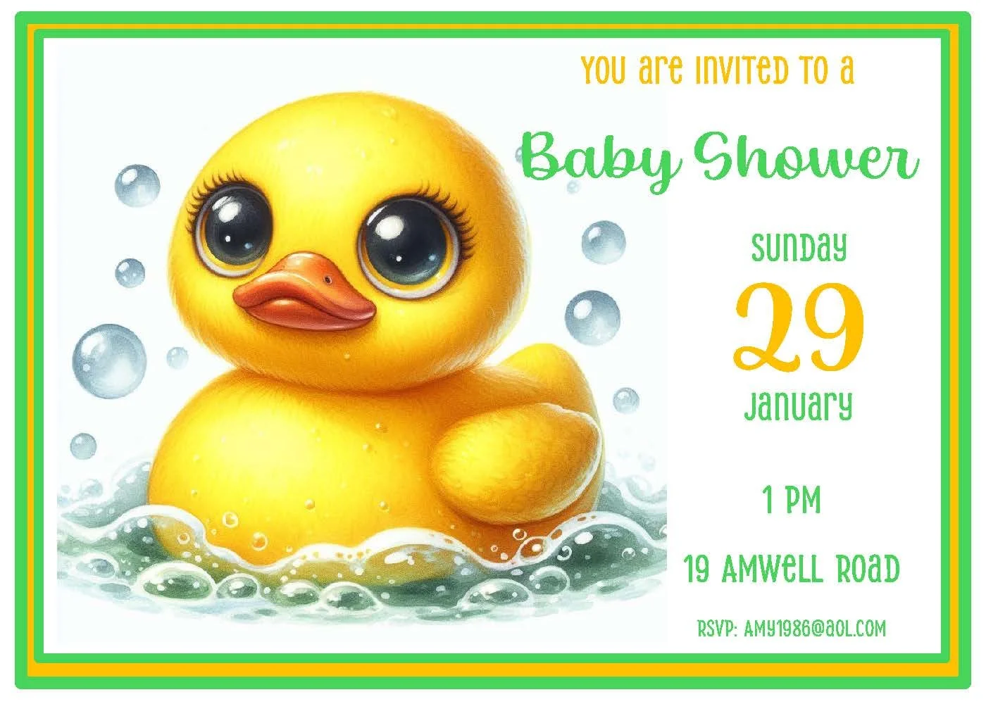 Nothing says baby like a cute rubber duckie! This cheerful Baby Shower invitation sets the tone for a splashy celebration, inviting guests to shower the mama-to-be with love and laughter. Bright, playful design and charming details make it perfect for a poolside bash, bath-time theme, or classic rubber duckie party. Ready to customize with date, time, and sweet RSVP info—this invite will get everyone excited to celebrate the new little one in style.