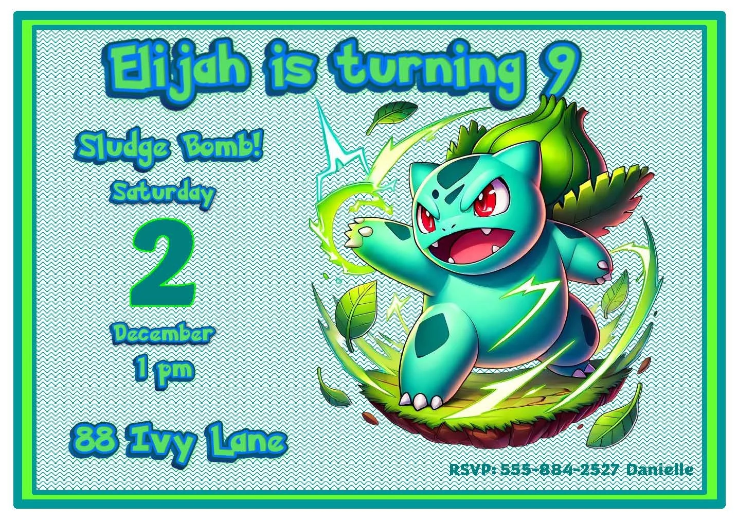 This green Bulbasaur invitation is one of many Pokémon characters and colors available in our Pokémon collection — perfect for a playful, themed party. Choose from a wide range of invitations, then complete the look with our matching custom activity placemat and coordinating goodie bag. Handmade with care, these pieces make planning easy and give your celebration a fun, polished touch.