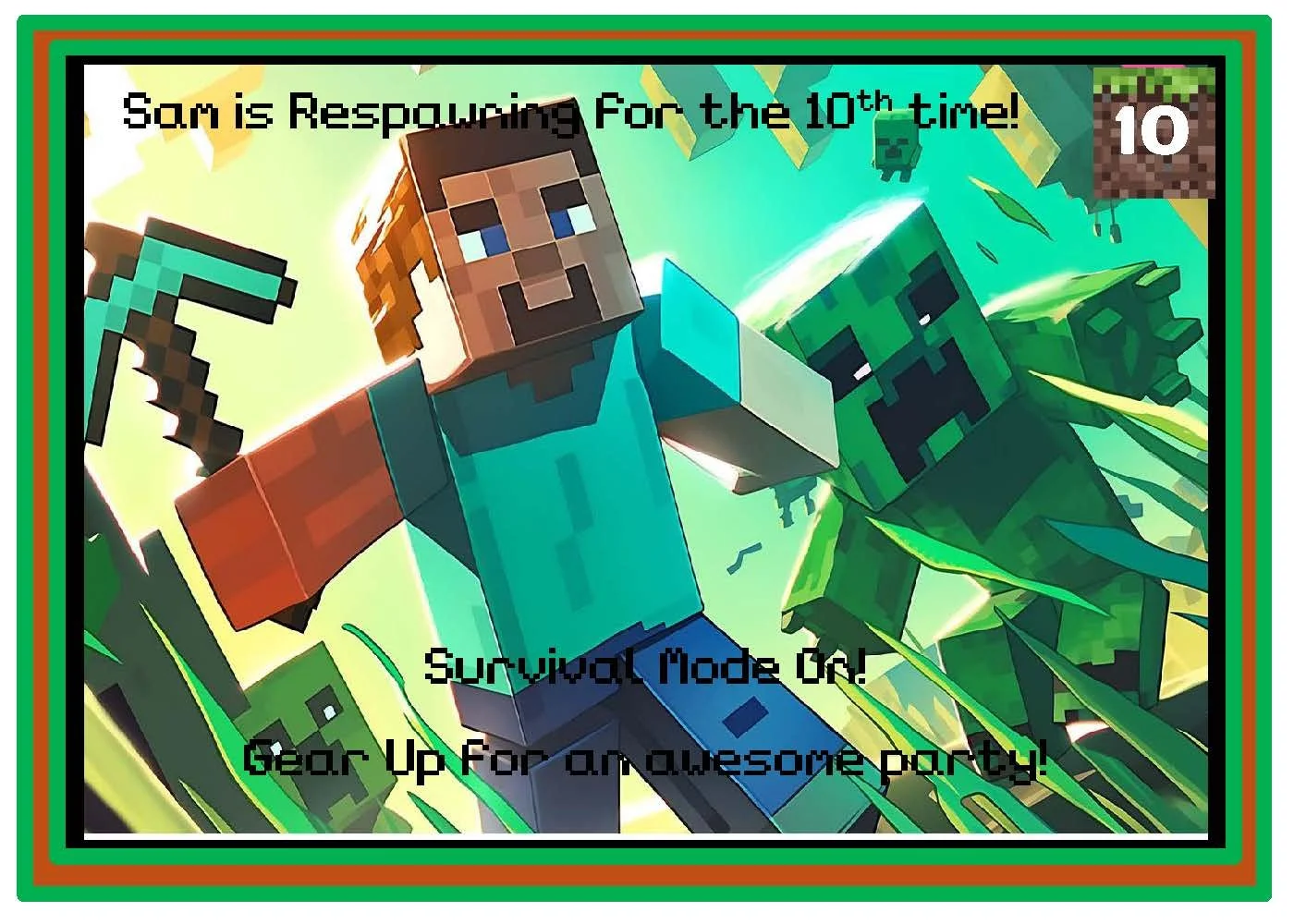 Steve sprints, a hissing Creeper hot on his heels — and your guest is invited to the chase! This Minecraft invitation promises an action-packed party full of adventure, daring builds, and blocky thrills. Perfect for fans of exploration and high-energy fun, it sets the tone for a celebration where every corner could hide treasure (or a surprise Creeper!). Grab your pickaxe and get ready to craft memories.