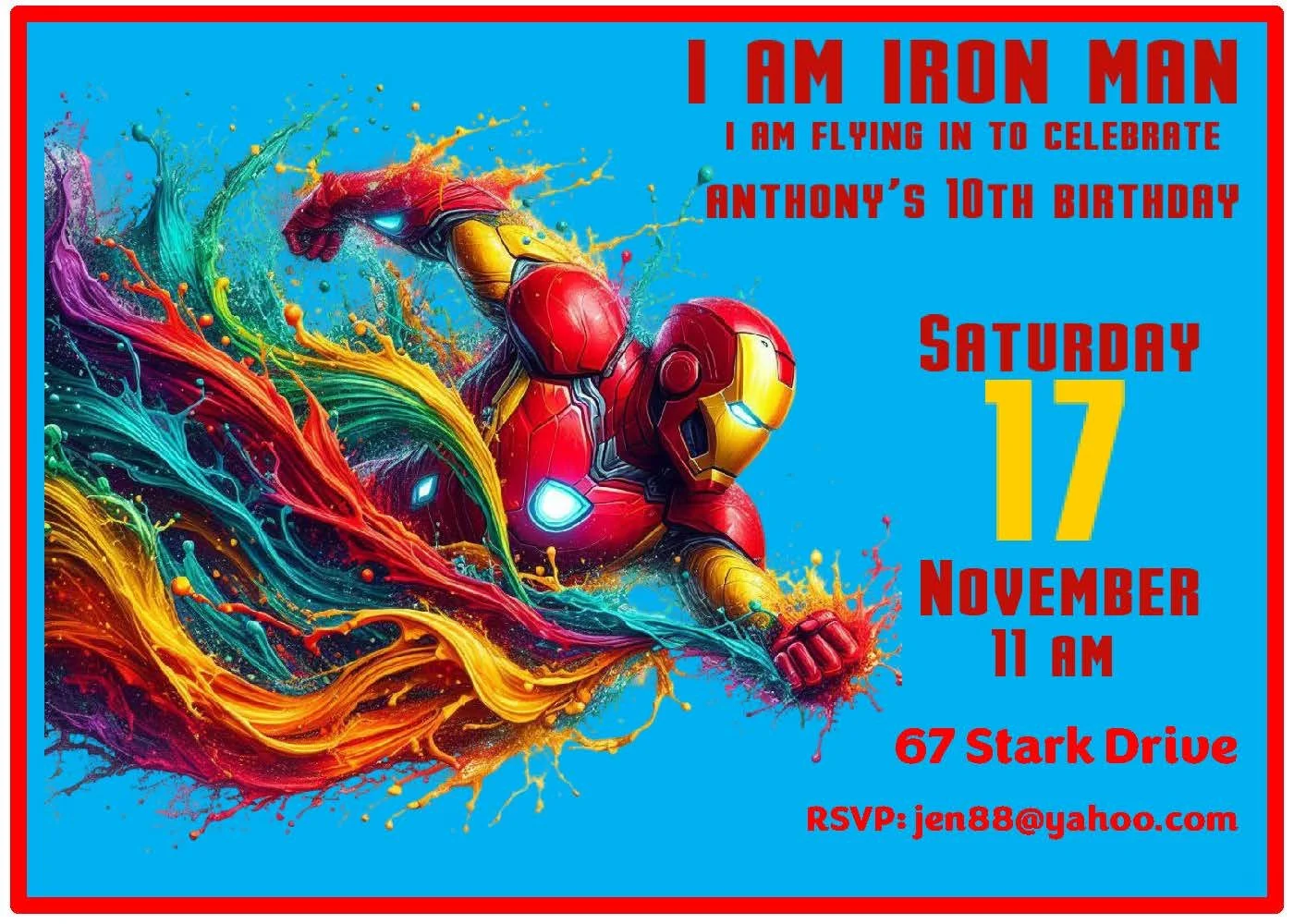 Get the party started with our Avengers invitation featuring bold red, blue, and black colors! Showcasing your favorite heroes—Hulk, Thor, Iron Man, and Captain America—this invite sets the perfect heroic tone for your celebration. Whether it’s a birthday bash or a superhero gathering, these powerful designs bring excitement and fun straight to your guests. Make your event unforgettable with this dynamic and action-packed invitation!