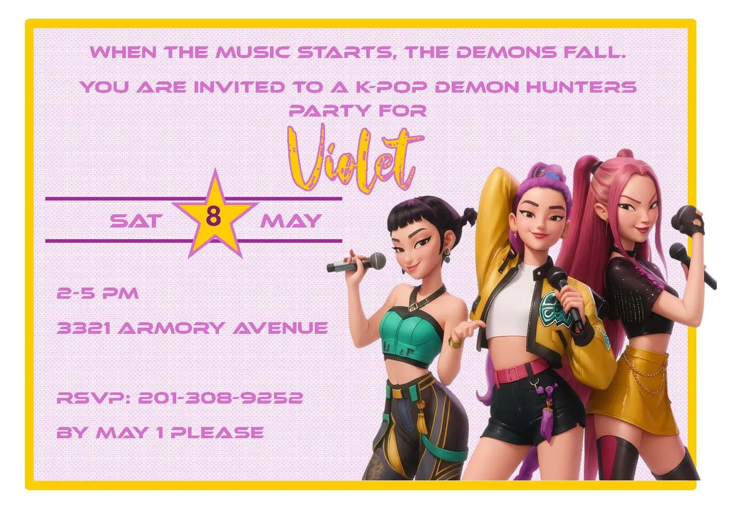 The K-Pop Demon Hunters invitation is perfect for fans of the popular Netflix movie. Designed in vibrant blue and purple hues, this invitation captures the dynamic energy of the film with bold fonts and iconic phrases that will impress fans both young and old. It’s the ultimate way to set the mood for a fun and memorable K-Pop Demon Hunters-themed party!