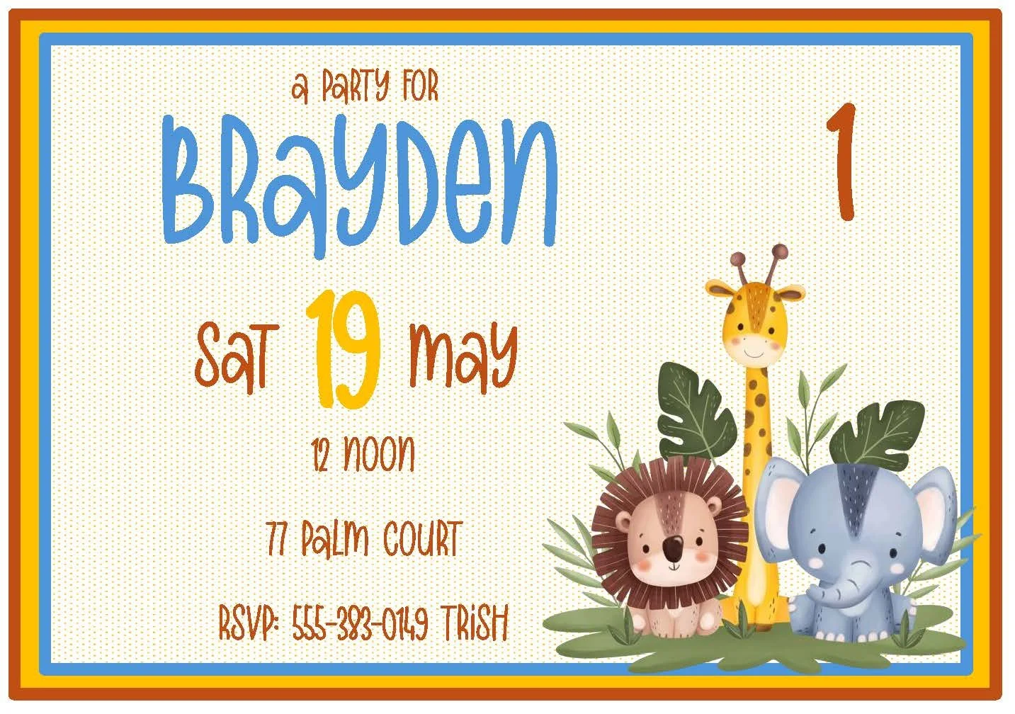 This adorable baby safari invitation is perfect for birthday parties, baby showers, and first birthdays. Featuring a sweet, friendly lion, giraffe, and elephant, this design brings playful charm and warm smiles to your celebration. Pair it with our matching jungle and safari invitations and activity placemats for a coordinated look that keeps little guests entertained. Ideal for printable or mailed invites, this cute set makes planning a breeze and adds a touch of safari magic to your special day.