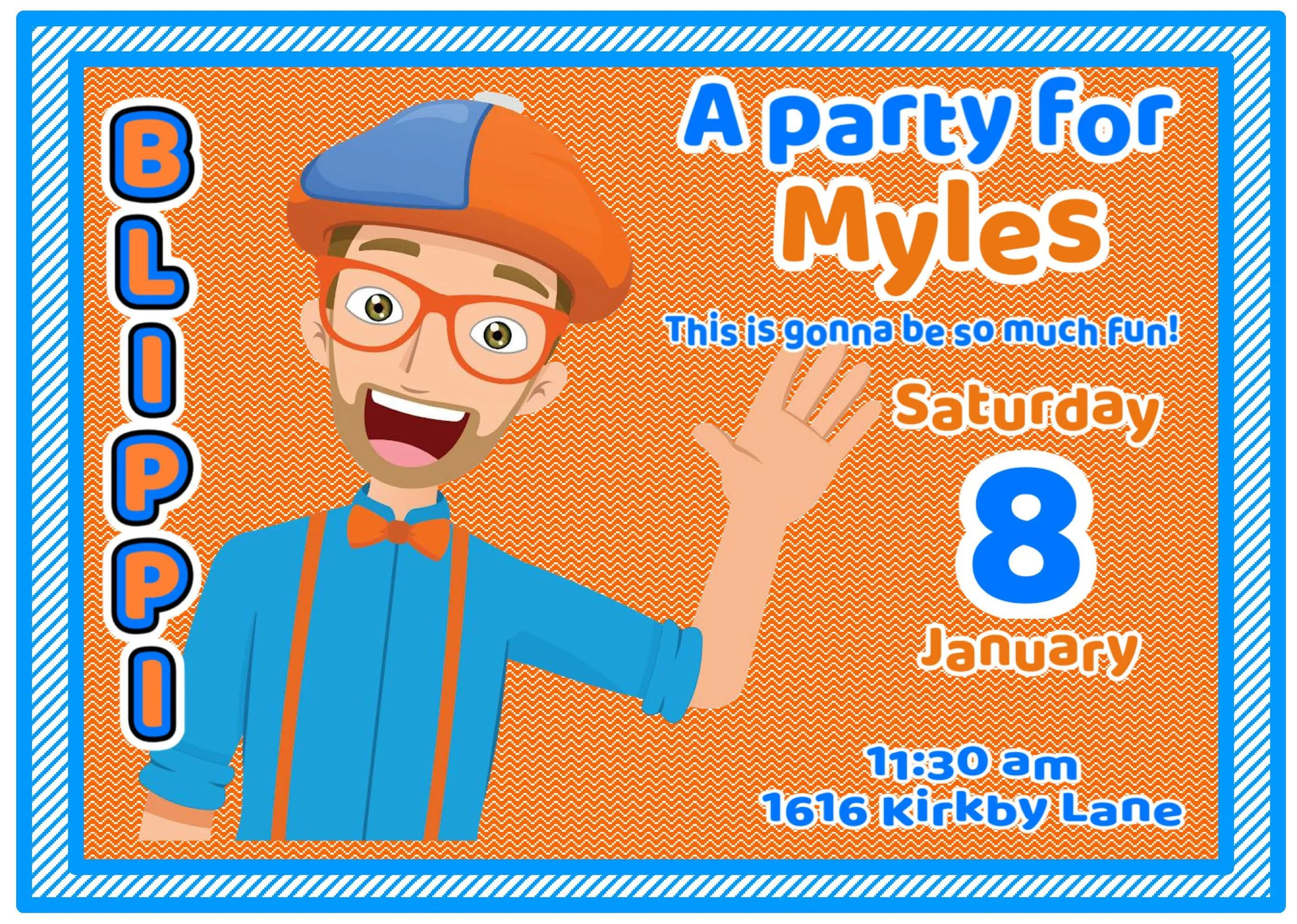 Get ready for a blast of colorful fun! This Blippi invitation pops with bright orange and cheerful blue, perfectly capturing the energetic, curious spirit kids love. Playful fonts, lively graphics, and space for all the party details make it easy to invite little explorers to a day of learning and laughter. Ideal for birthdays, playdates, or any celebration where imagination takes the lead.