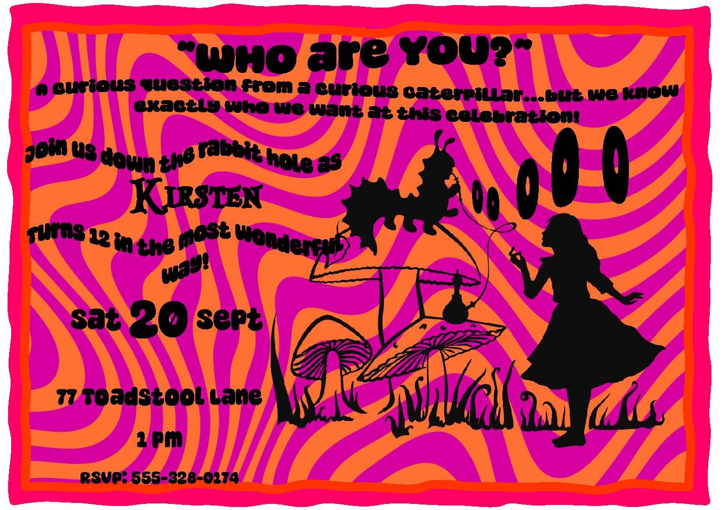 Dive down the rabbit hole with this trippy pink and orange invitation from our Alice in Wonderland collection. Swirling colors and whimsical patterns set a playful, surreal tone that’s perfect for tea parties, birthday celebrations, or any curious gathering. Handmade with attention to detail, the vibrant design captures the quirky spirit of Wonderland while leaving space for your party details. Send an invite that’s as delightfully unexpected as your event.