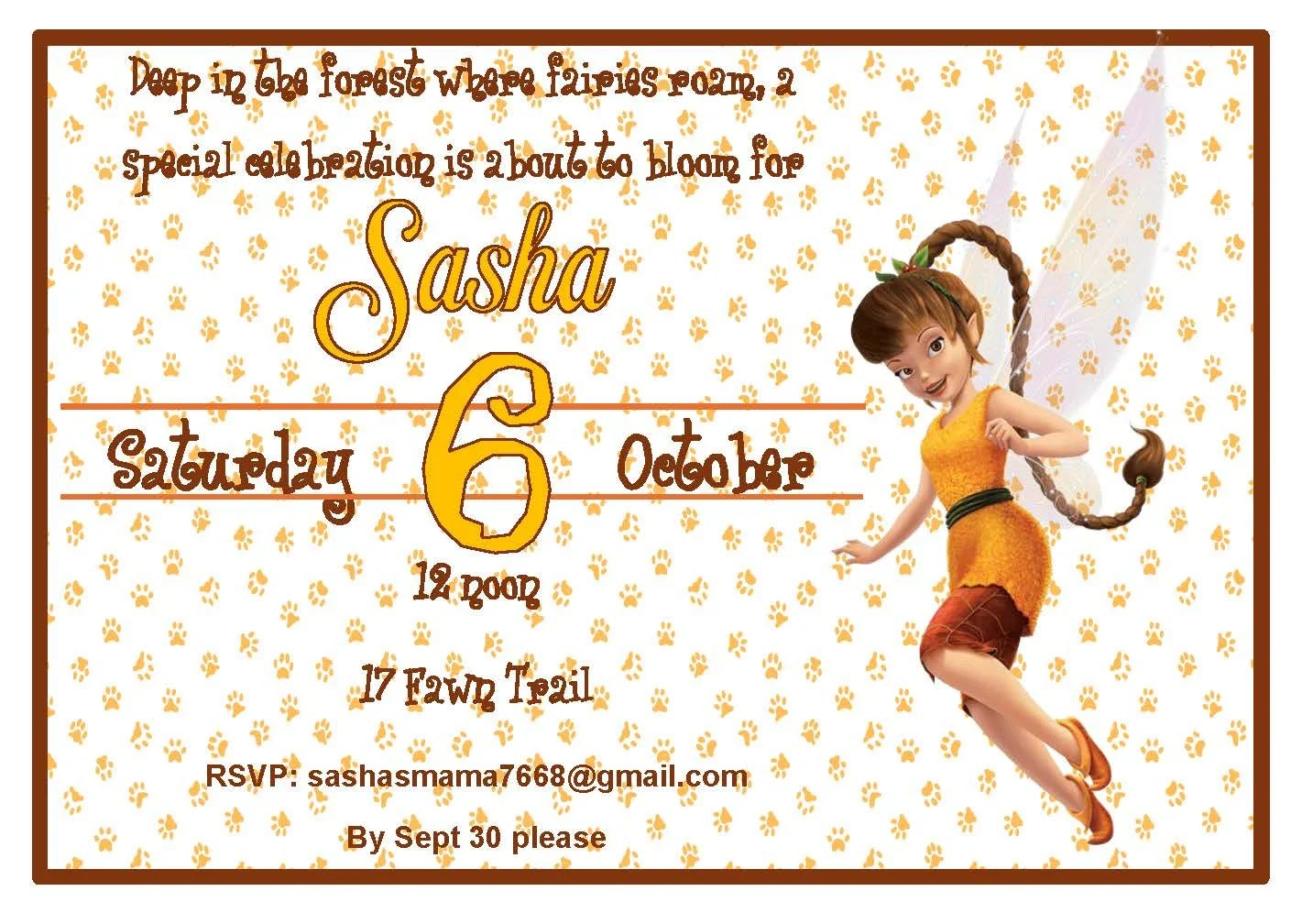 This whimsical fairy invitation features Fawn, the gentle fairy of animals, artfully designed in warm orange and earthy brown hues. Adorned with playful paw prints and delicate woodland accents, it captures a cozy, nature-inspired charm perfect for animal-loving kids and woodland-themed parties. The design balances sweet fantasy with rustic style, making it ideal for birthdays, nature playdates, or any celebration where furry friends and forest magic are the stars.