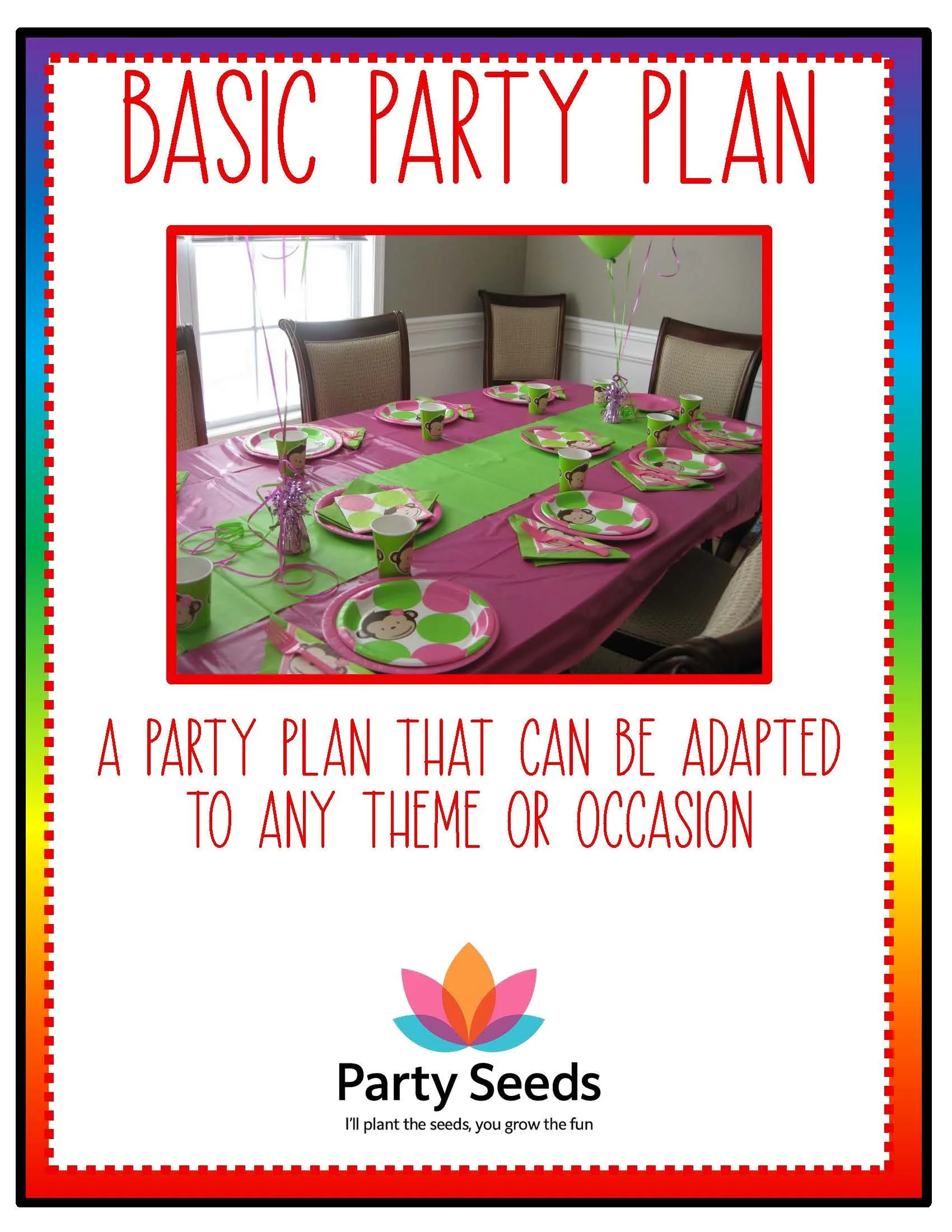 Party Seeds Guide: The Ultimate 38-Page Full-Color Party Planning Workbook A practical, adaptable, full-color guide to planning and executing the perfect party — for birthdays, baby showers, bridal showers, graduations, holidays, and any themed event. Use this workbook to move from spark to celebration with clear timelines, printable templates, decorating and food ideas, games, favors, and checklists. Everything is written in a friendly, approachable voice and designed so you can adapt each section to any theme.