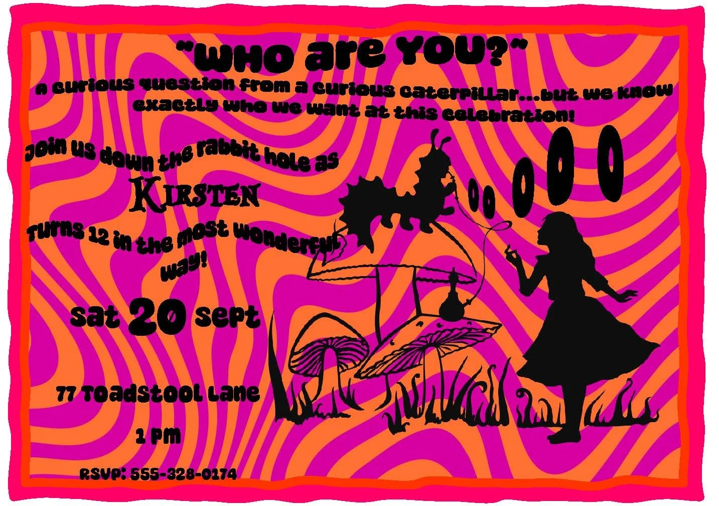 This trippy Alice in Wonderland invitation captures the dreamy exchange between Alice and the Caterpillar in a swirl of bright pink and orange hues that echo curiosity and playful delirium. Bold colors and whimsical details pull guests straight into the storybook moment, making it perfect for imaginative birthday parties, tea parties, or any celebration with a touch of wonder. Pair it with other invitations from our Alice collection and add a custom activity placemat to keep little guests entertained and immersed in the adventure.