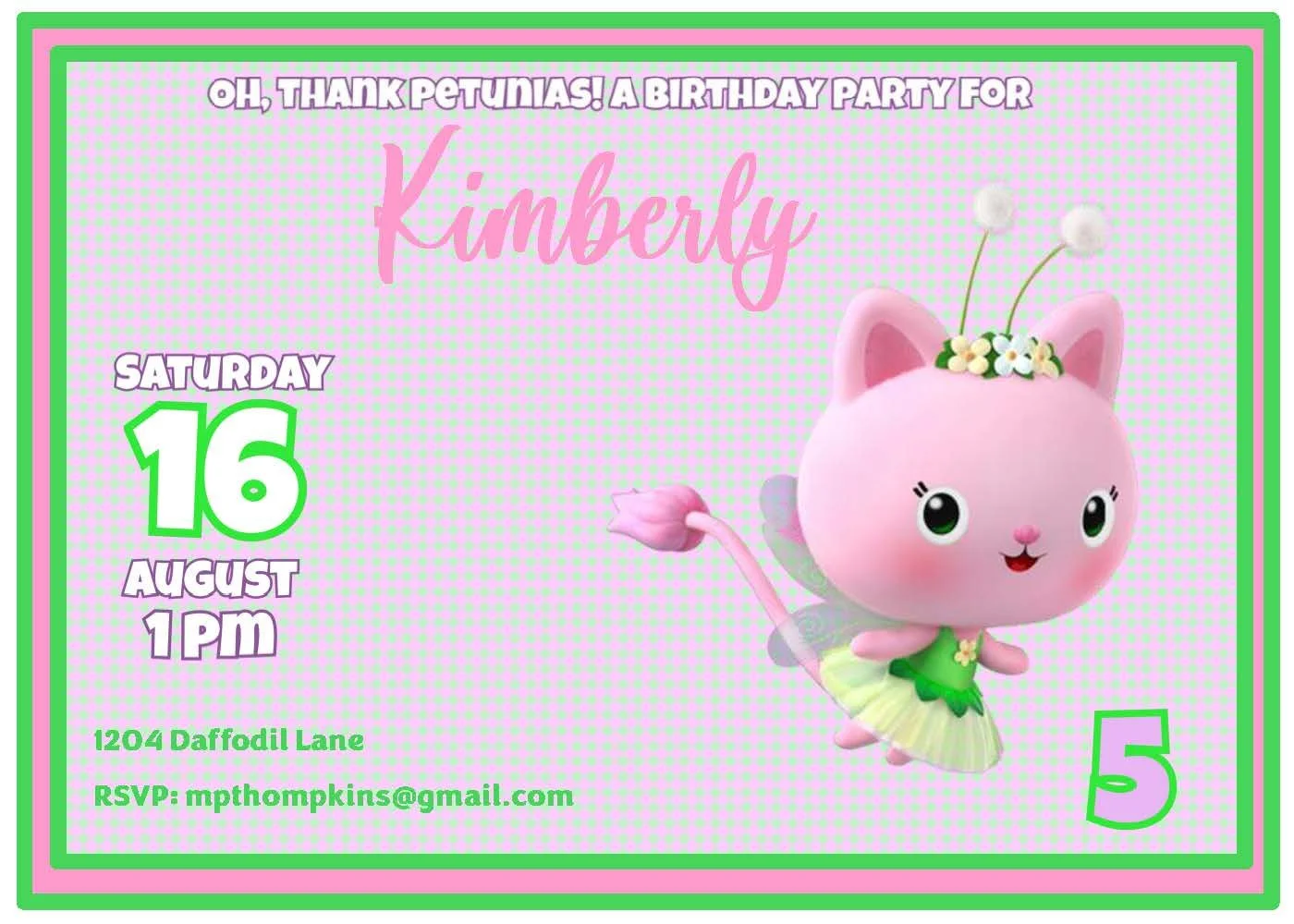This Kitty Fairy invitation is simply delightful in soft pink and green. Featuring the beloved character from Gabby’s Dollhouse, it brings whimsical charm and sweet sparkle to any celebration. Perfect for birthday parties, garden gatherings, or tea parties, this invitation sets a playful, magical tone that will enchant your guests and get everyone excited to celebrate. Ideal for little fans who love fairy-tale fun and colorful details.