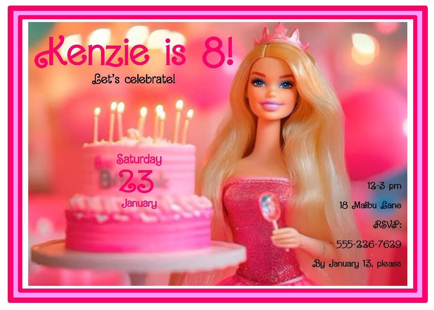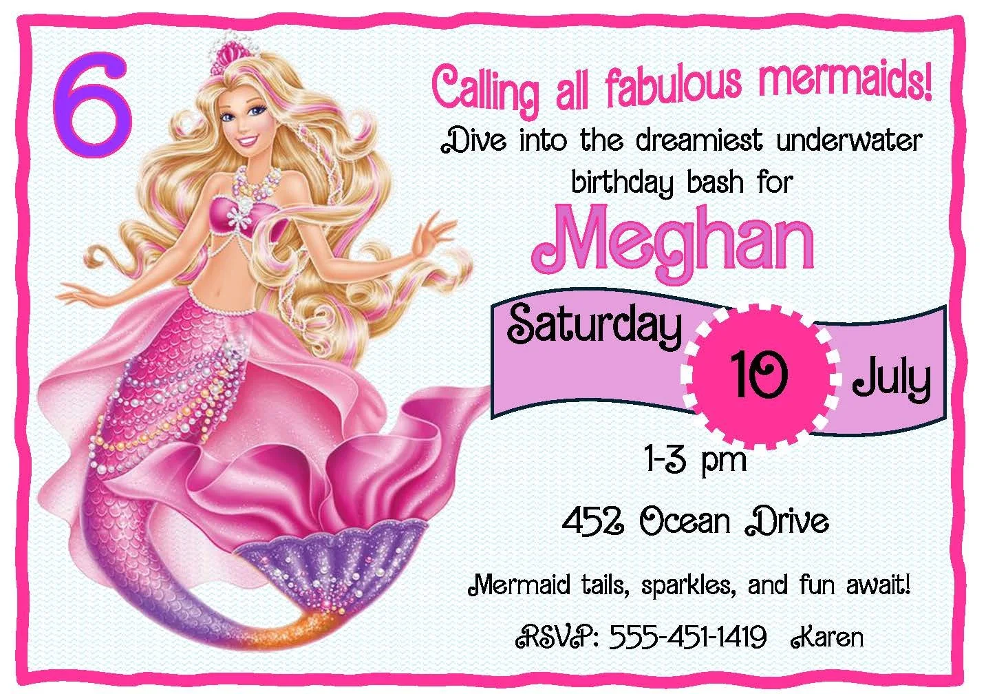 Make a splash with our Barbie Mermaid Invitation in dreamy pink and purple! Featuring the iconic Barbie font and an enchanting portrait of Barbie with flowing, luminous hair, this invite captures seaside glam and playful elegance. Soft gradients of coral-pink and twilight purple set a whimsical backdrop, while sparkles and seashell accents hint at underwater adventure. Perfect for mermaid-themed birthdays, pool parties, or Barbie celebrations—customizable text and RSVP details make planning effortless. Send an invitation that’s as magical and stylish as the guest of honor.