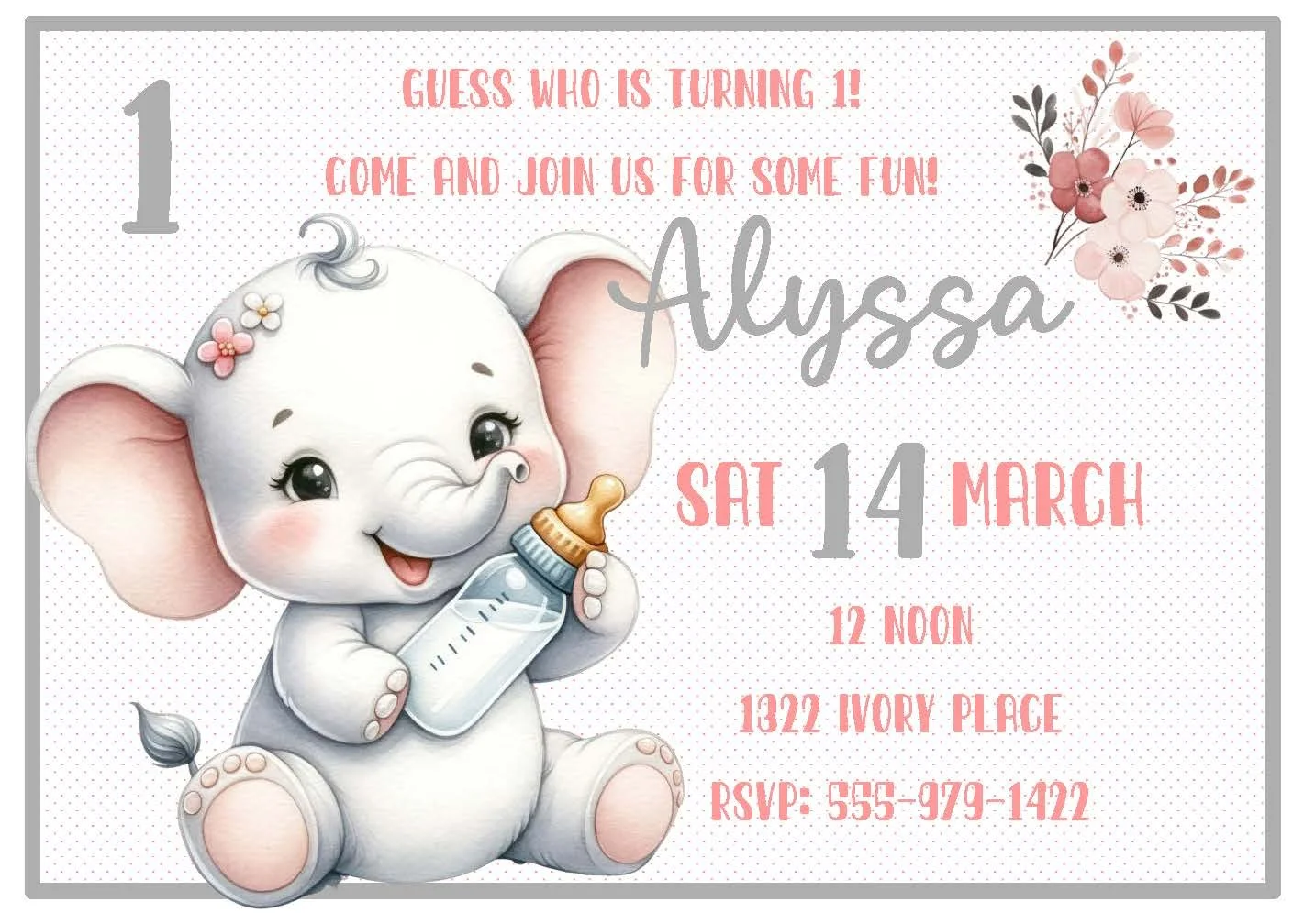 This cute and cuddly baby elephant invitation is the sweetest touch for baby showers or birthdays — soft gray tones against a gentle pink and gray background, with delicate floral accents that add a whimsical charm.