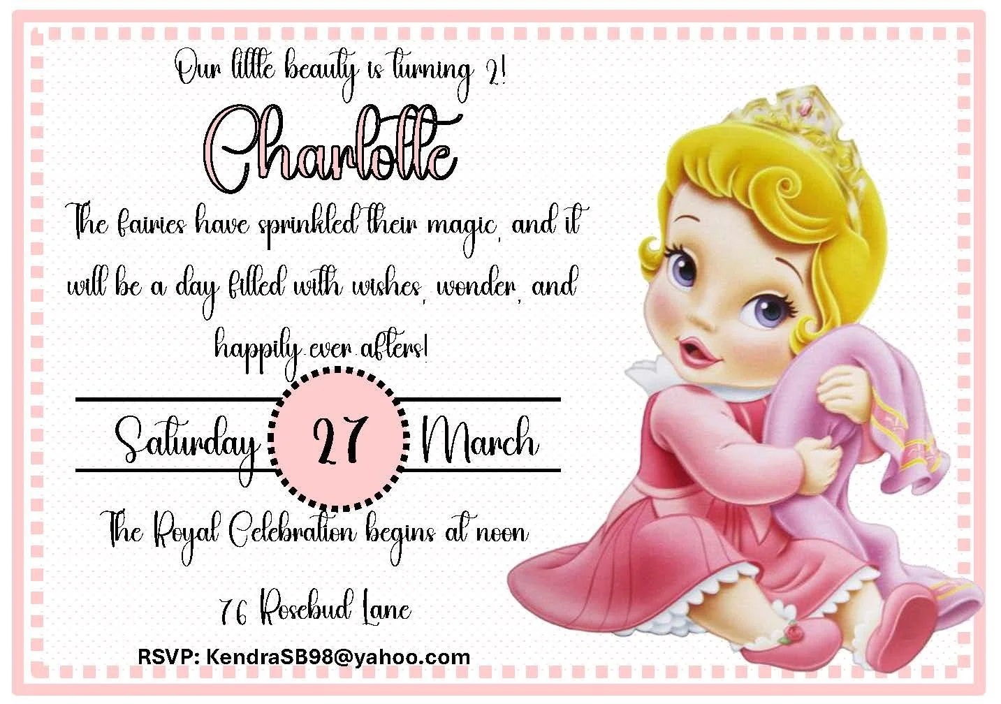 This Baby Aurora invitation is a sweet, whimsical choice for first birthdays, toddler parties, baby showers, or any celebration welcoming a little princess. Featuring Baby Aurora in soft pastels and charming details, this design brings a gentle, storybook feel that’s both adorable and timeless. Part of our baby-Disney Princess collection, it pairs perfectly with coordinating decor and other baby-ified favorites to create a cohesive, heartwarming theme. Simple to customize and lovingly crafted, it’s the perfect way to announce your little one’s special day.