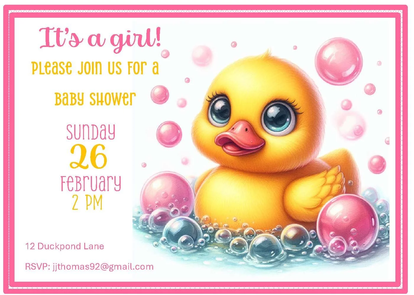 Cheerful and bright, this baby shower invitation features an adorable rubber duckie surrounded by playful pink bubbles — perfect for setting a joyful tone for your special celebration. Sweet and simple, the design captures warm excitement and invites guests to share in the fun. Prefer a different color? This invitation is also available in blue or green to match any nursery theme.