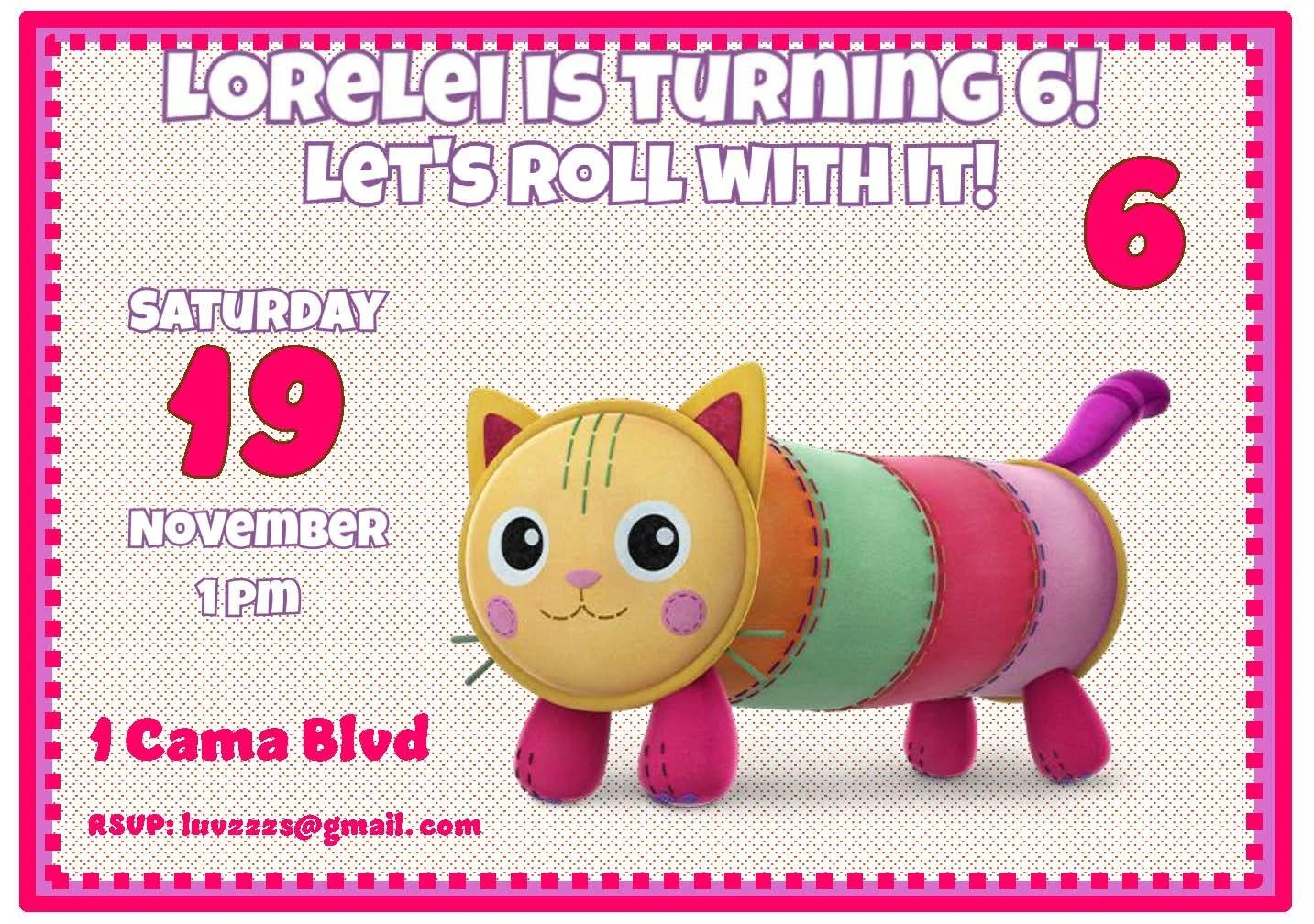 Thjis Pillow Cat invitation from Gabby's Dollhouse in pink is irresistibly cute and cuddly — perfect for little fans of Pillow Cat! This adorable invite features soft pink tones, a plush Pillow Cat illustration, and playful details that set the tone for a cozy, fun-filled celebration. Easy to personalize and sure to delight guests, it’s the sweetest way to invite friends to your child’s special day.