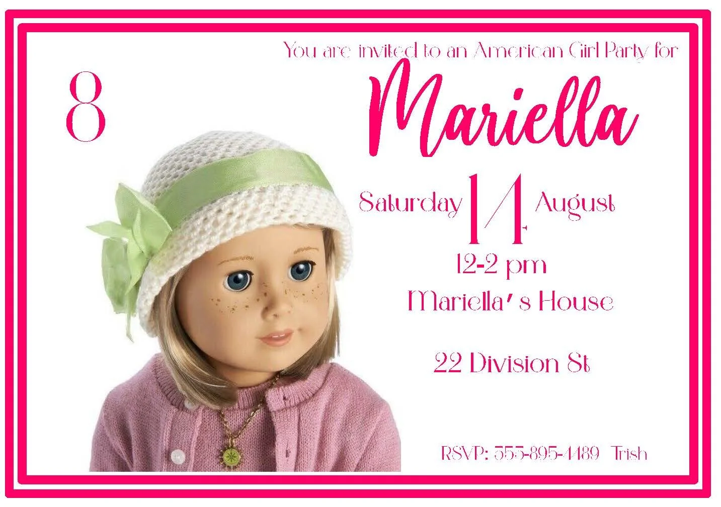 This American Girl Doll invitation is one of many in our large collection — perfect for birthday parties, doll tea parties, or any special celebration with a favorite doll. We offer several different dolls and styles to match your child’s personality and party theme, from classic looks to trendy outfits and seasonal designs. Each invitation is thoughtfully designed with charming details and customizable text so you can add party specifics, RSVP info, and a personal message. Handmade with care, these invitations make sending invites as special as the day itself.