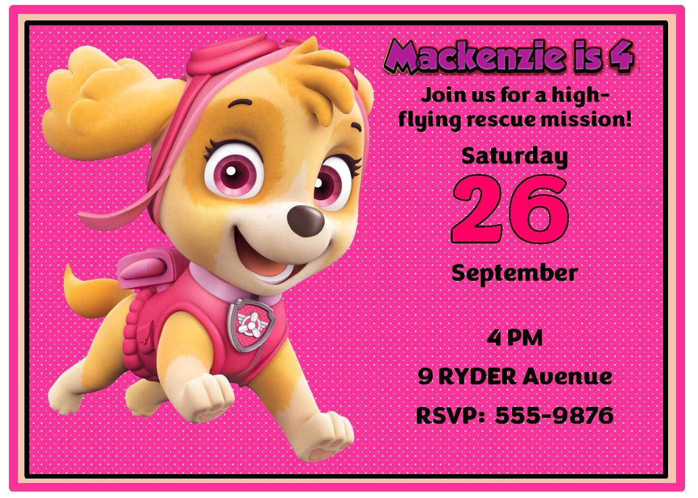 Our Skye invitation is bold and vibrant in pink, capturing her fearless spirit as she leaps into action. Perfect for birthday parties and pup-packed celebrations, this design brings energy and charm to every invite. Explore our extensive Paw Patrol collection to find more Skye styles, all the pups, and coordinating pieces—including a custom activity placemat to keep little guests entertained. Tailor the look to your party with matching decor and stationery for a seamless, playful theme.