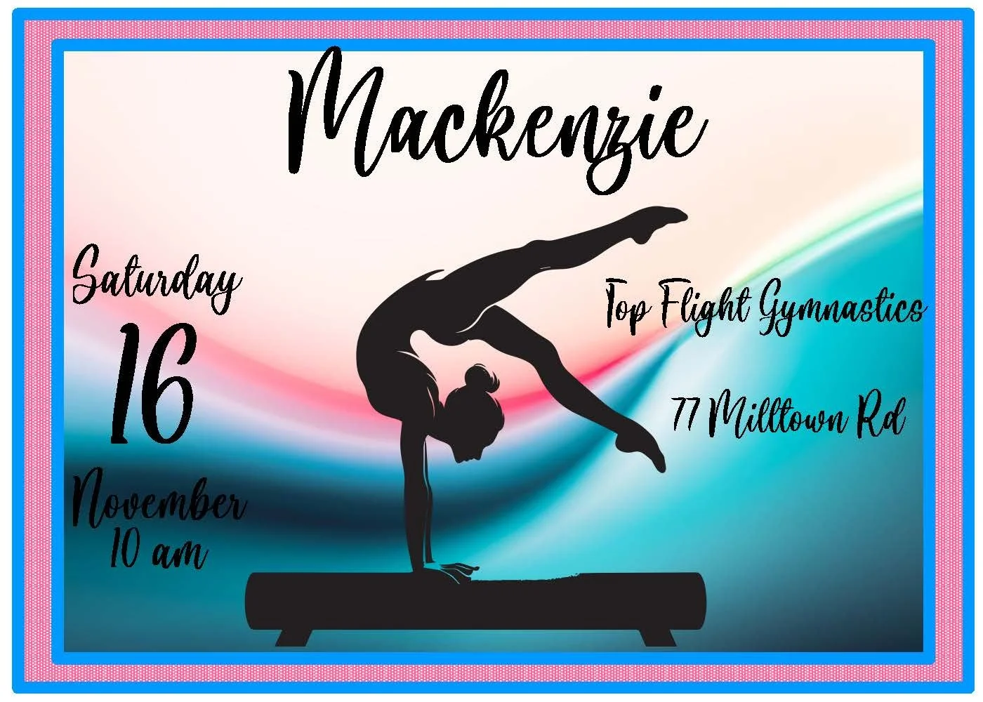 Sleek and pretty in pink and blue, this gymnastics invitation perfectly balances sporty energy with sweet style. Clean lines and a modern layout showcase the party details while playful pink and blue accents add a cheerful, feminine touch. Ideal for tumblers, cartwheels, and celebration alike—easy to personalize and ready to set the tone for a fun, unforgettable gymnastics-themed birthday.