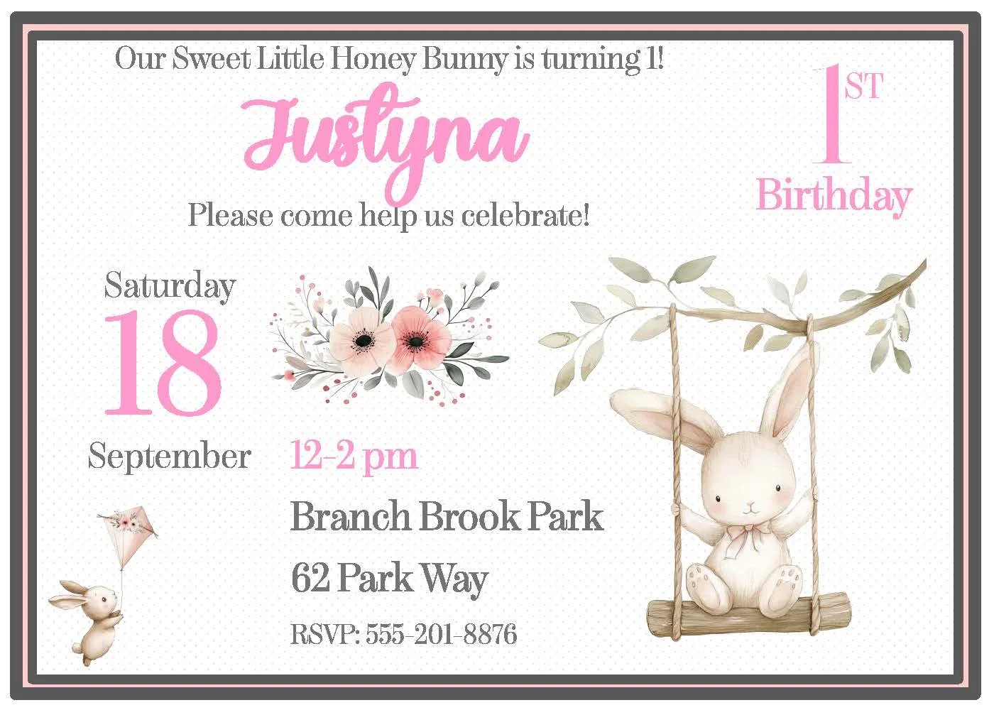 This birthday party invitation is perfect for first birthdays or any celebration. A sweet little bunny swings her way across the design, bringing a touch of whimsy and gentle charm that delights kids and grown-ups alike. Soft pastels, cheerful details, and plenty of room for your party info make this invite an easy, adorable choice for memory-making moments. Ideal for baby showers, milestone birthdays, or anytime you want a sweet, playful vibe.