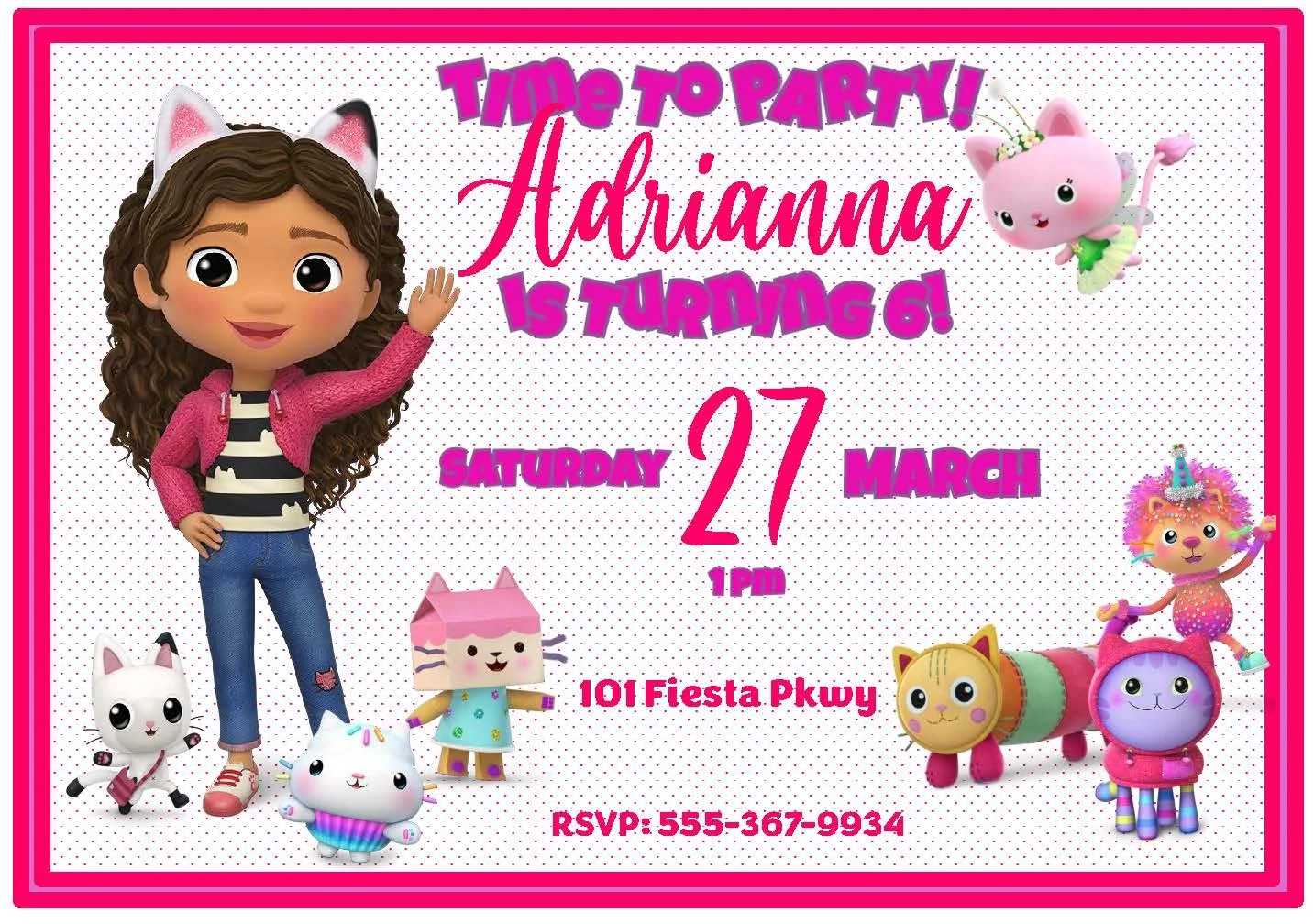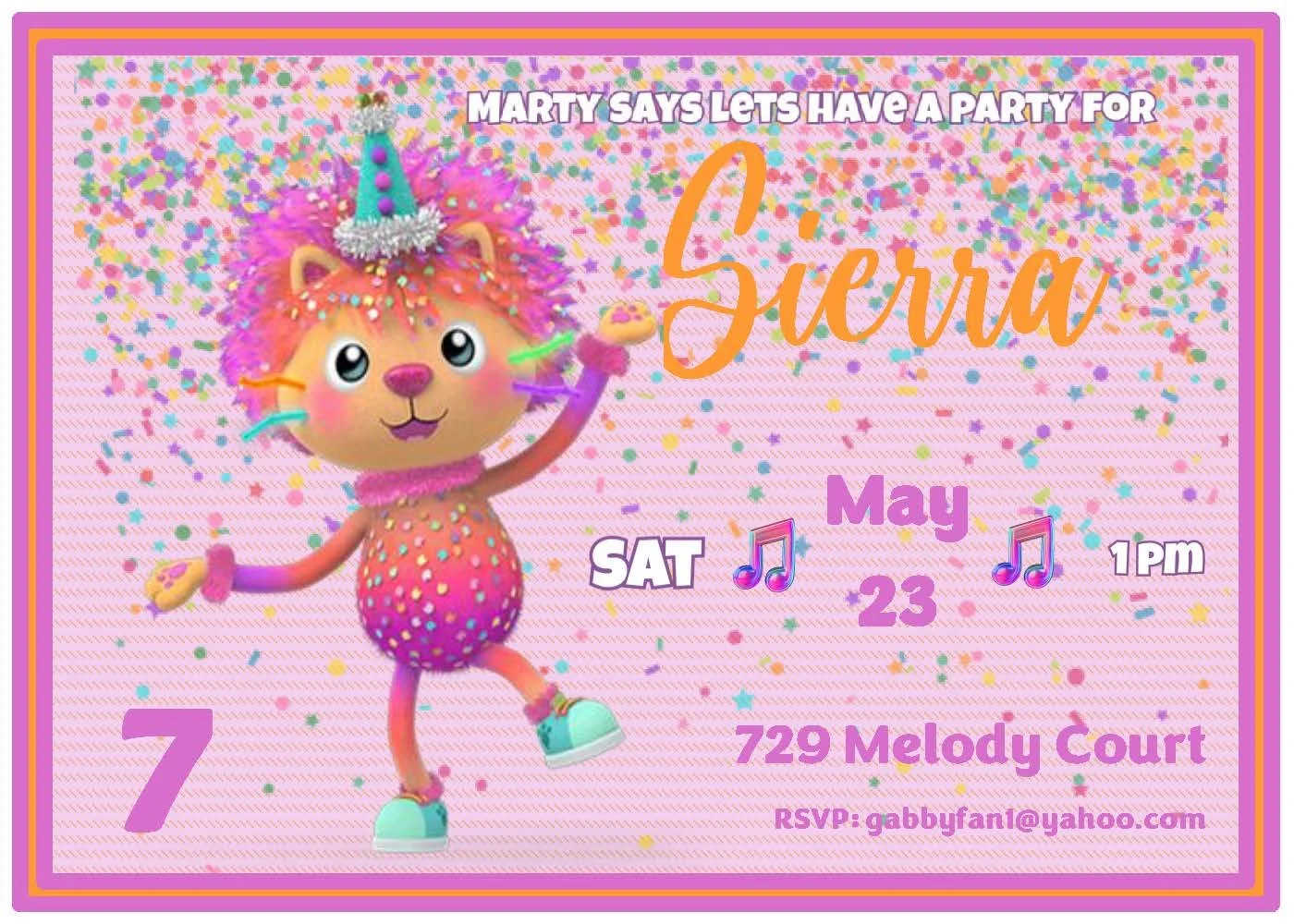 This fun and festive invitation featuring Marty the Party Cat will get your guests excited for a super fun time! Designed in cheerful pink, purple, and orange with lots of confetti, it’s the perfect way to kick off your celebration. Want a different character? No problem — our Gabby’s Dollhouse collection has all the kitties ready to make your invitation purr-fect!