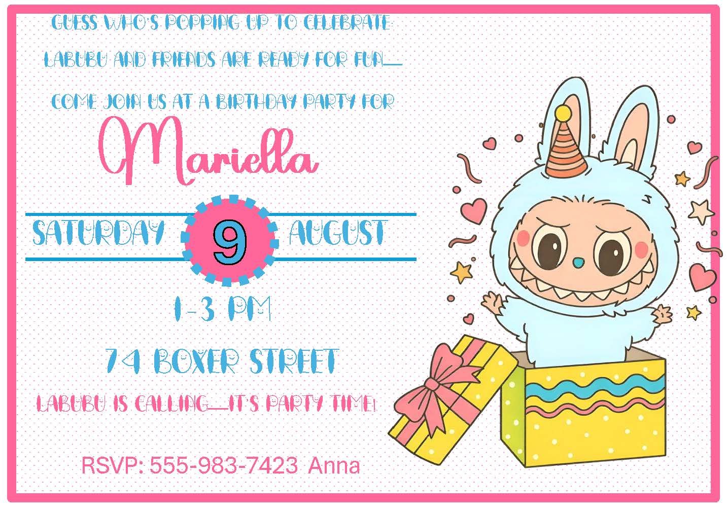 This playful invitation features Labubu popping out of a birthday present, greeting guests with wide-eyed delight. Soft pastel colors — think cotton-candy pink, mint, and buttery yellow — give the design a gentle, festive vibe perfect for kids’ parties, baby showers, or sweet-sixteen celebrations. The whimsical illustration and cheerful palette set a fun, welcoming tone and make RSVP details pop. Ideal for anyone who loves cute, lighthearted decor with a touch of surprise.