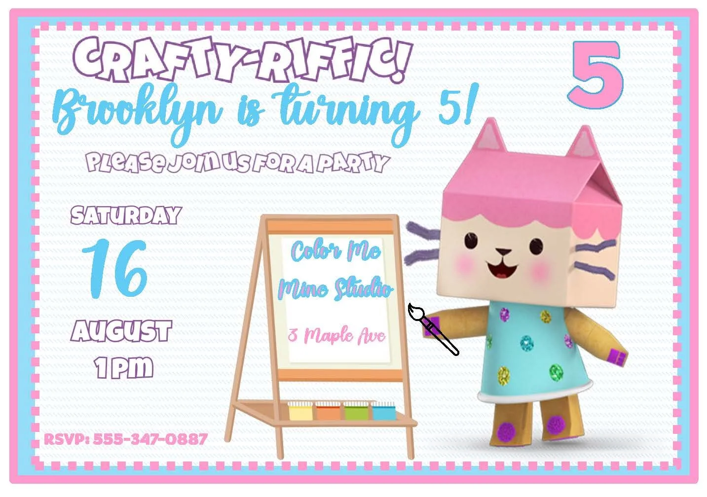 This Baby Box Cat invitation is perfect for a birthday party, art party, or painting party. Baby Box is standing at her easel, ready to create a great time—paint-splattered paws, a bright smile, and a palette full of playful colors set the scene for a hands-on celebration. Cute, cheerful, and full of creative energy, this invite lets guests know fun and messy masterpieces are on the agenda. Prefer a different Gabby’s Dollhouse character? Our Gabby’s Dollhouse collection offers all the kitties and characters so the invite matches your party personality.