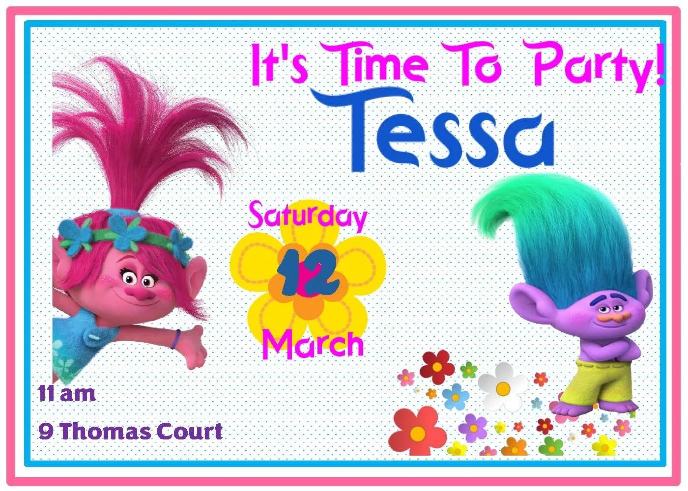 This happy Trolls invitation bursts with lively, joyful energy—bright pinks, blues, and sunny yellows make it pop with playful charm. Perfect for birthday parties and cheerful celebrations, the bold colors and whimsical design set a fun tone from the moment guests open the envelope. Handcrafted with care, this invitation brings smiles and excitement to every celebration.