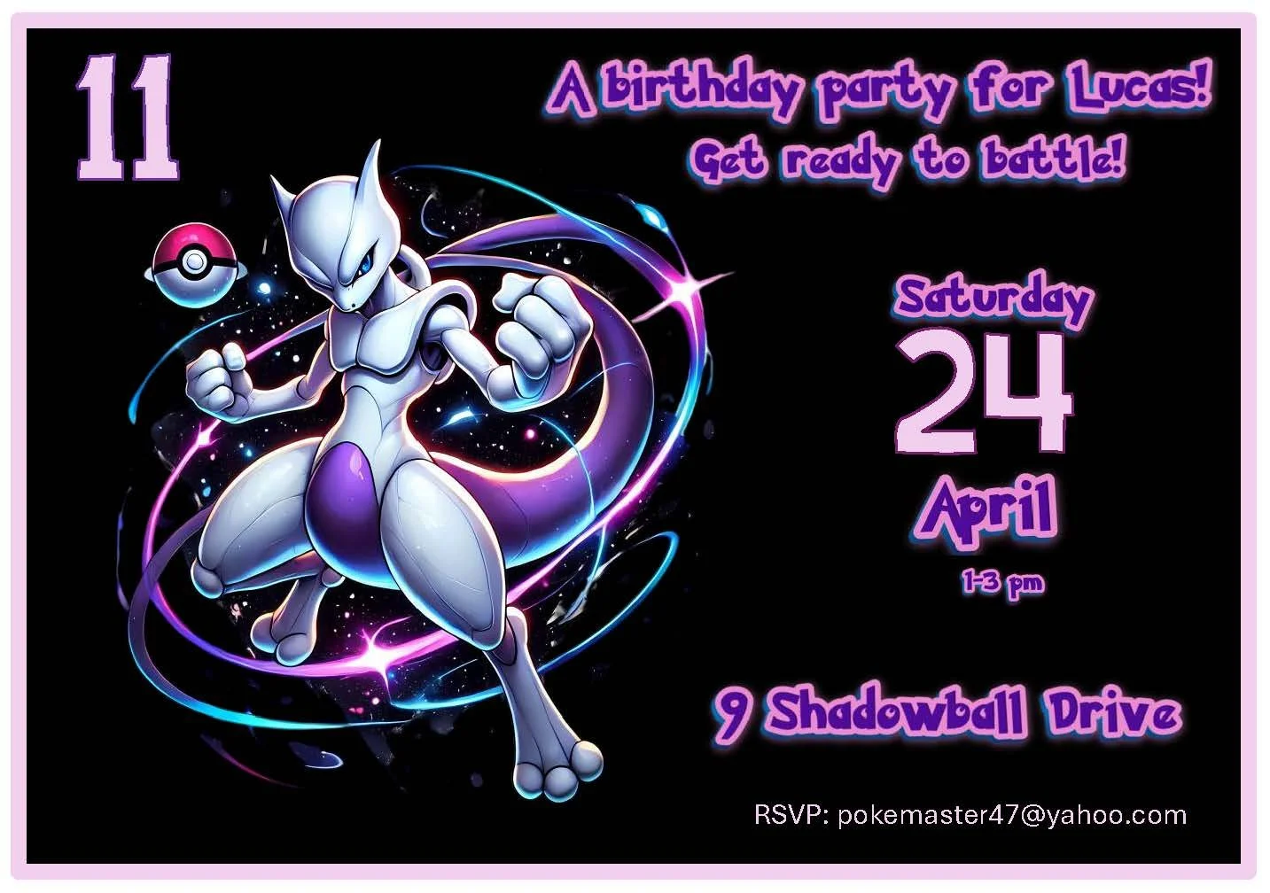 This intense Mewtwo invitation unleashes the power of Mewtwo to get guests hyped for an epic party! Featuring bold, dynamic artwork and customizable text, it’s the perfect way to set the tone for battles, adventures, and Pokémon fun. Pair it with our matching Pokémon invitations and activity placemat to keep little trainers entertained from invite to party end. Ideal for birthdays, game nights, or any Pokémon celebration that needs legendary energy.