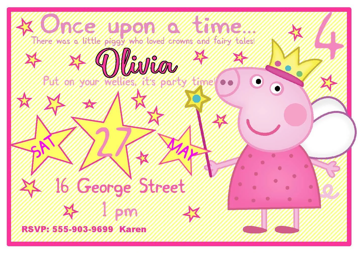 Make your little guest of honor feel like the star with our Peppa Pig invitations — playful, bright, and full of charm! Featuring cheerful pink and sunny yellow hues, adorable Peppa illustrations, and space for all the party details, these invitations set the perfect, celebratory tone. Fun, friendly, and ready to send, they’ll have guests excited to join the festivities before the party even begins. Perfect for birthdays, playdates, and fans of Peppa’s playful world.