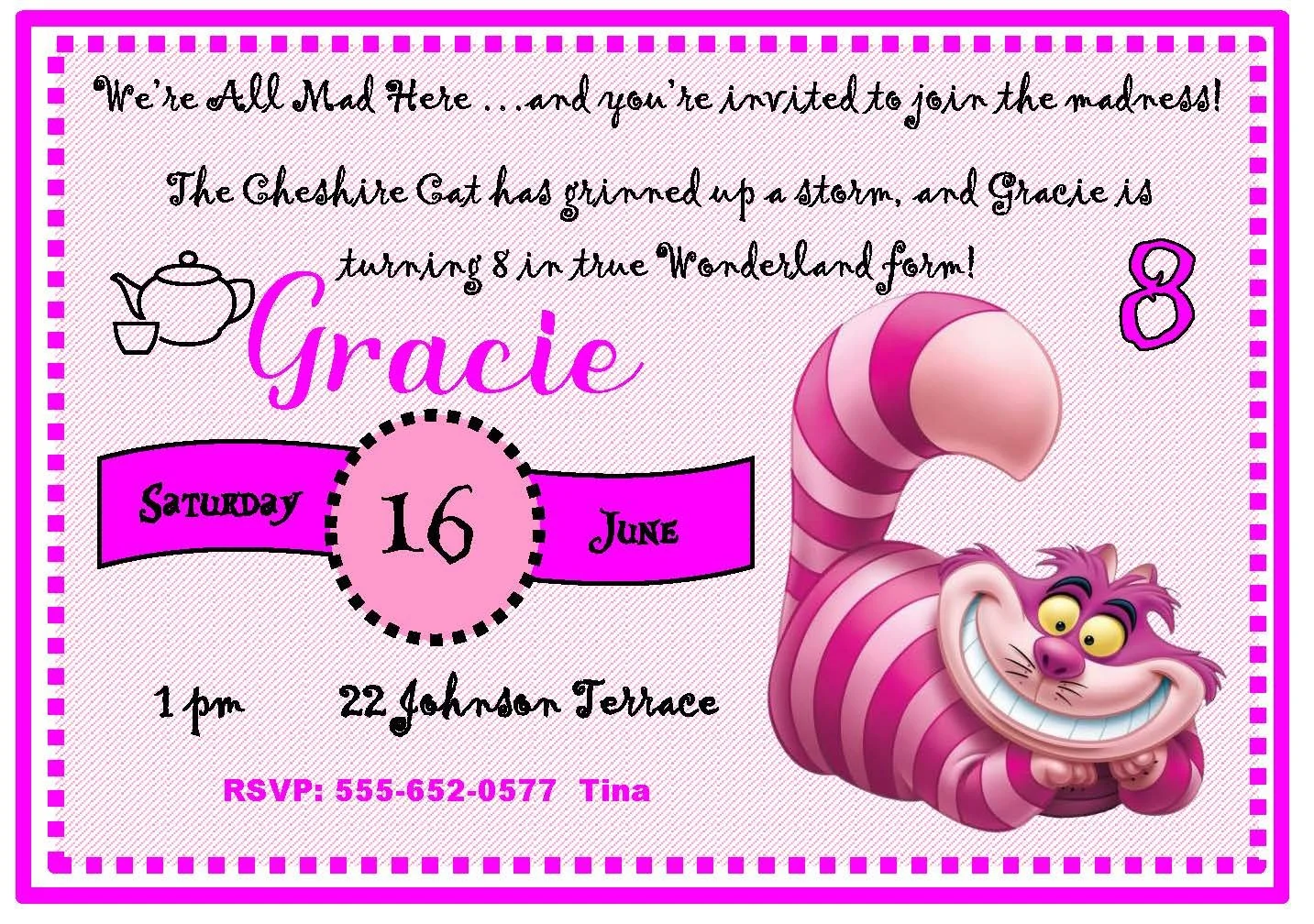 This whimsical invitation features the Cheshire Cat grinning mischievously and proclaiming, "We're all mad here, and you're invited to join the madness." Perfect for Alice in Wonderland–themed parties, tea parties, or any delightfully quirky celebration, the design blends playful charm with a touch of mystery. Bright colors, a sly smile, and bold lettering set the mood for an unforgettable gathering—expect curious treats, unexpected fun, and a night where normal rules simply don't apply. RSVP and prepare to tumble down the rabbit hole!