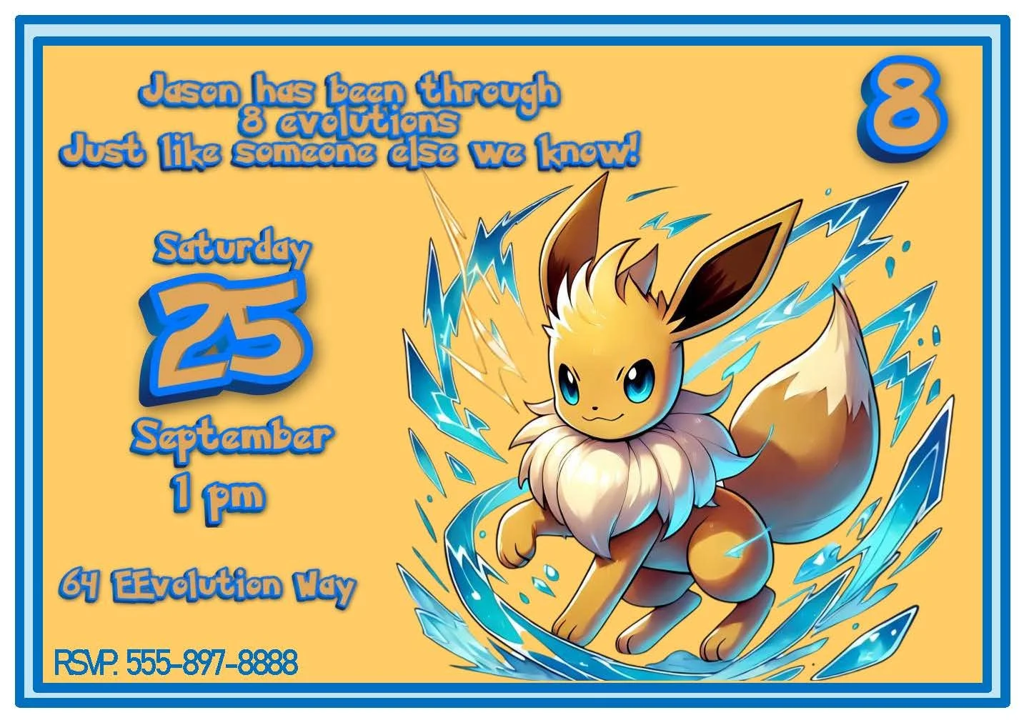 Get ready to celebrate with our adorable Pokémon invitation featuring Eevee, everyone’s favorite evolution-ready companion! Designed in warm tan and brown tones with pops of cool blue, this invite perfectly captures Eevee’s playful spirit. Whether it’s a birthday party or a fun gathering, these invites set the perfect tone for a day full of adventure and joy. Your guests will love the charming design, and you’ll love how easy it is to customize and send!