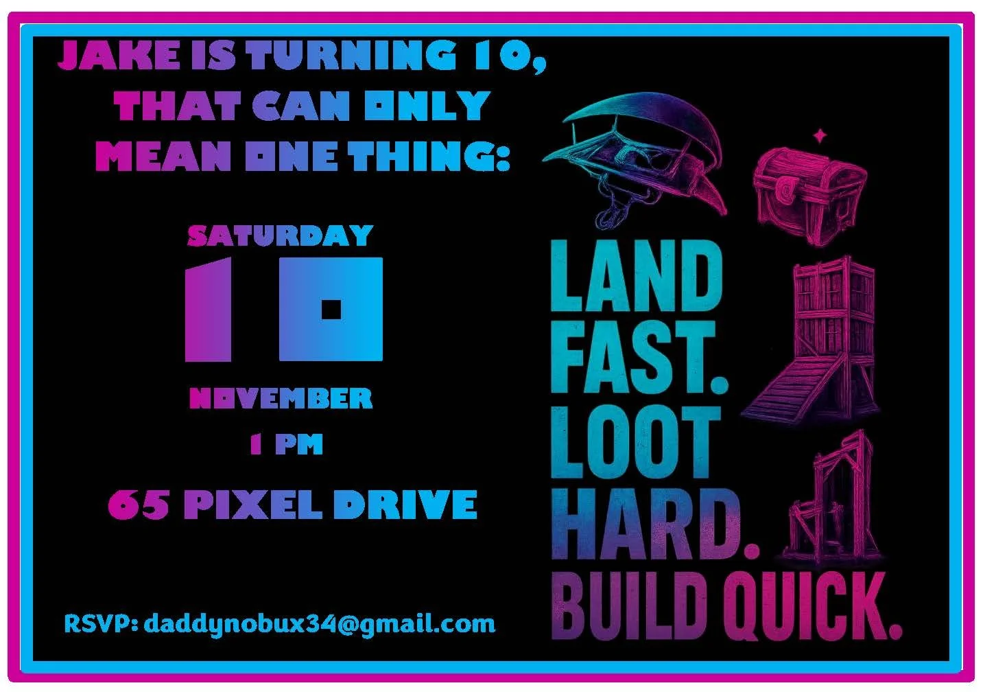 This bold Fortnite invitation in black, purple, and blue will grab the attention of gamers of all ages. Featuring iconic in-game symbols and themed wording, it sets the tone for an action-packed celebration. The high-contrast color scheme and dynamic design make it perfect for birthday parties, game nights, or victory-themed events — just add party details and you're ready to drop in.