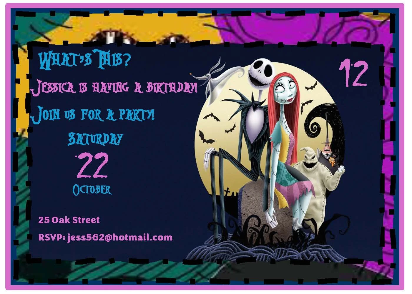 Creepy-cute meets classic Halloweentown charm with this colorful invitation starring Jack and Sally — everyone’s favorite spooky sweet couple. Bold Nightmare Before Christmas–style fonts pop over a patchwork background inspired by Sally’s iconic dress, blending eerie elegance with playful color. Perfect for Halloween parties, themed birthdays, or movie-night gatherings, this invite sets the tone for a magical, slightly mischievous celebration. Add your details and send a little spooky love to your guests.